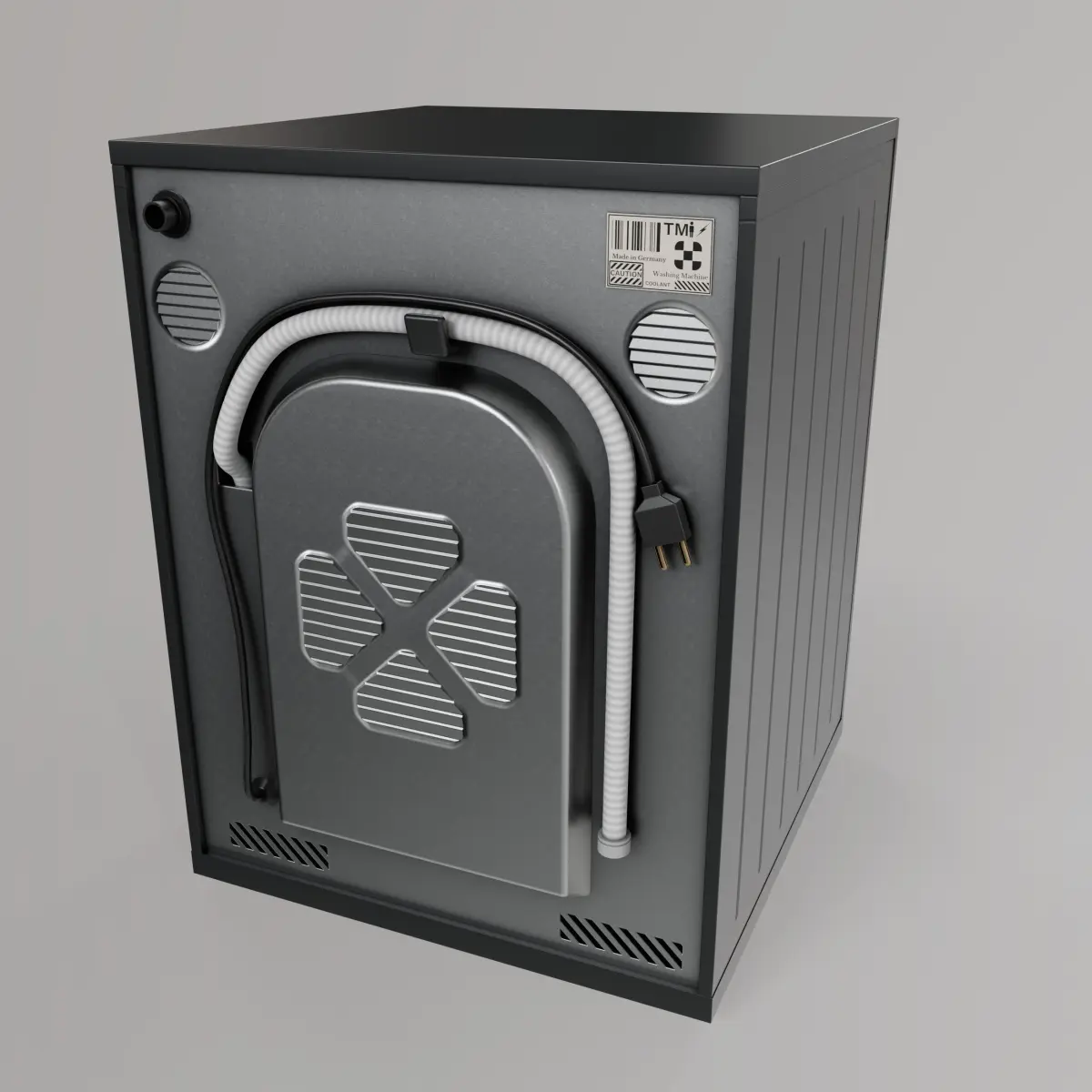 A minimalist all-black washing machine with hidden control panels and a silent motor, blending seamlessly into modern home decor.