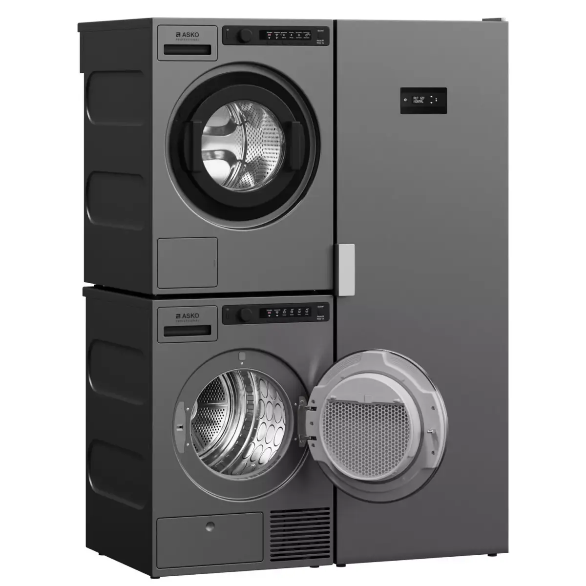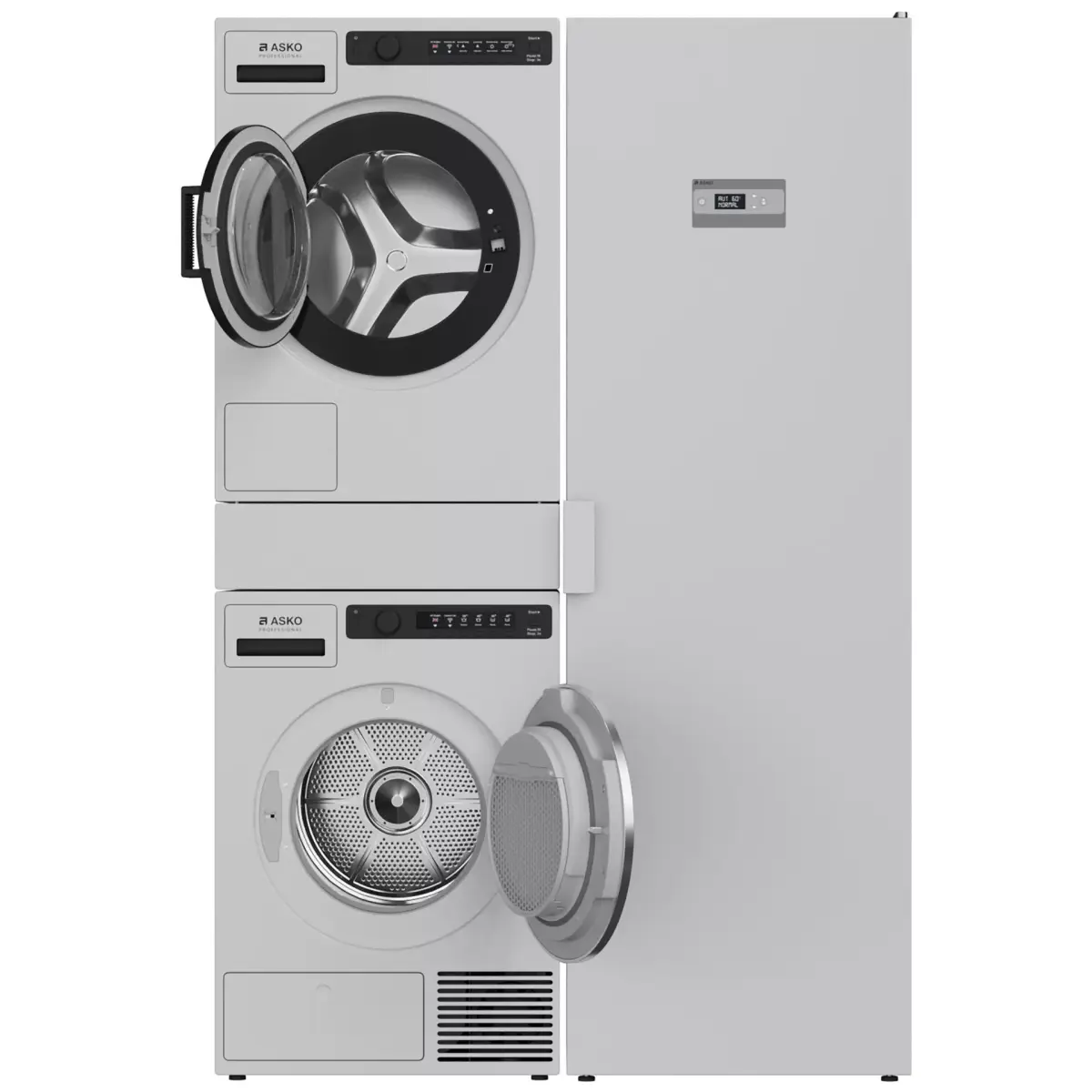 Laundry set: Washing machine, tumble dryer and Asko drying cabinet in two versions: 170cm and 184cm in height.The doors of the washing machine and dryer open, the pivot at the door is set up.2 colors: titanium and white. If necessary, the color can be easily edited with the CoronaColor/VRayColor card.The set consists of: