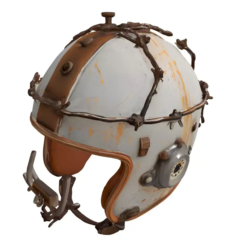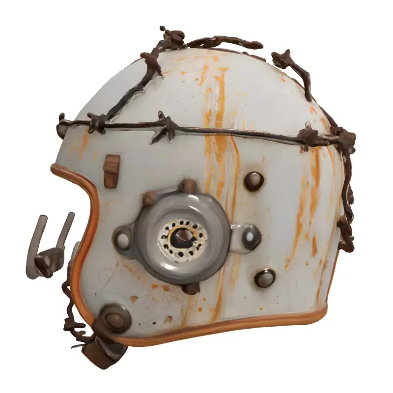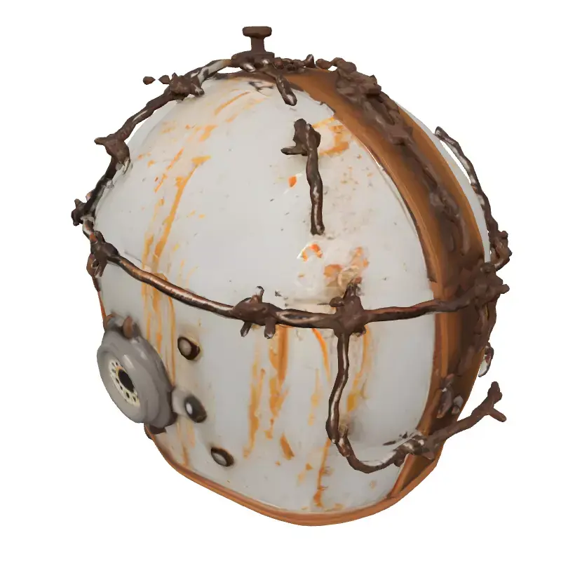 This meticulously crafted 3D model depicts a rugged, post-apocalyptic combat helmet, designed with an intense focus on dystopian aesthetics and a history of hard-worn survival. It features a distressed white base with significant rust, grime, and chipped paint, vividly conveying a long history of use in harsh, unforgiving environments. The helmet is uniquely adorned with menacing barbed wire, meticulously wrapped and integrated into its design, providing both a formidable appearance and an implication of improvised protection. A distinctive metallic circular attachment on the side, possibly an old sensor or comms unit, further enhances its scavenger-tech appeal, while multiple visible rivets secure its various components. The interior boasts realistic, worn brown padding, suggesting a level of comfort despite its tough and intimidating exterior, ready to protect any wasteland wanderer.