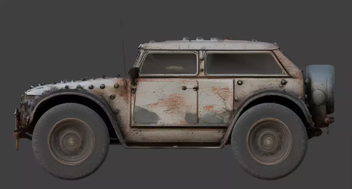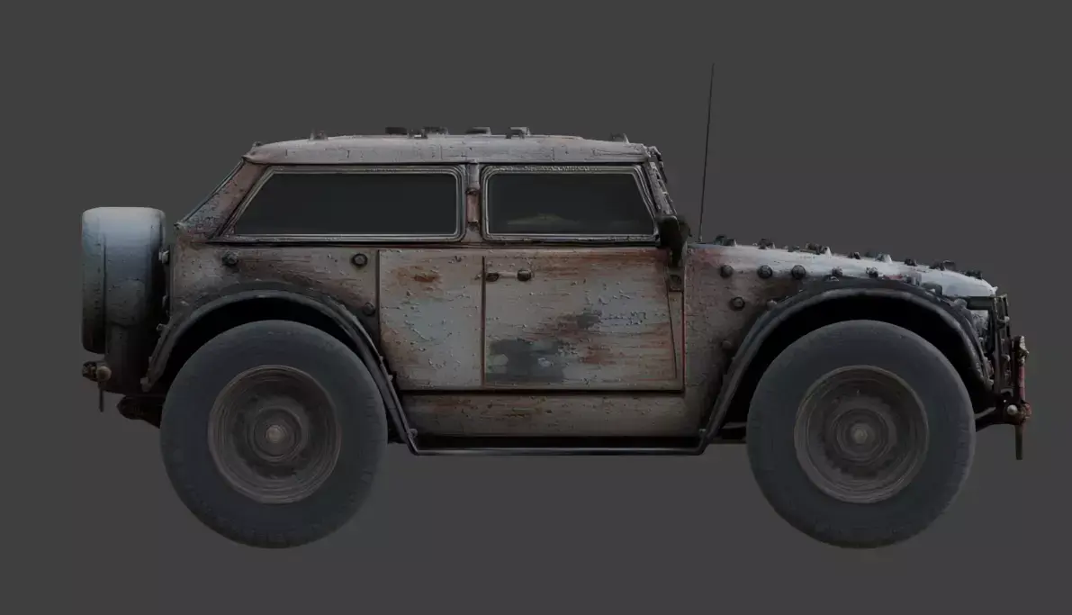Tagswasteland car, post-apocalyptic, 3D model, rusted vehicle, survival truck, armored vehicle, PBR materials, offroad, weathered automotive, game ready, tactical SUV, rugged pickup