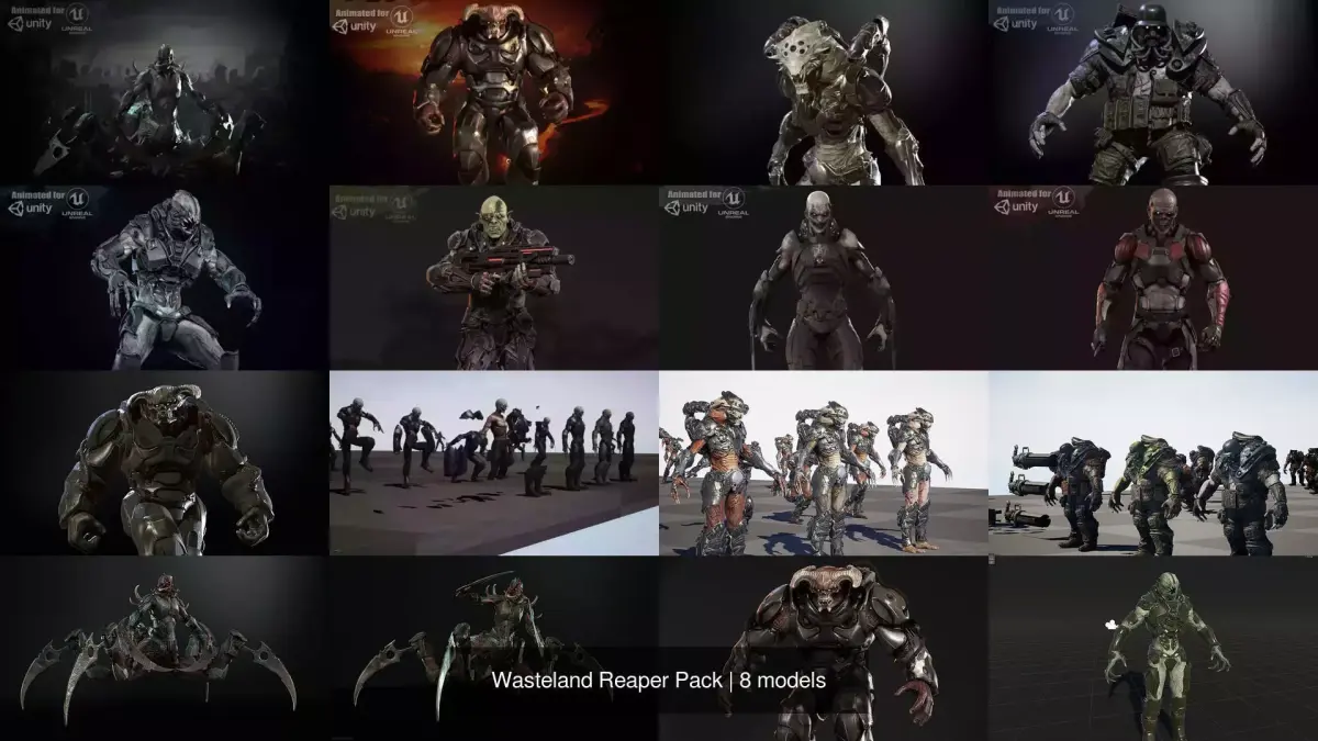 - Unleash a squad of nightmarish biomechanical mutants into your game world. This premium character pack includes 8 unique, fully rigged and animated monstrosities — from armored juggernauts and alien beasts to cybernetic soldiers and demonic warlords. Each model is optimized for real-time performance and ready for immediate integration into your RPG, sci-fi shooter, survival, or action title.- Whether you're designing a post-apocalyptic wasteland, a hostile alien planet, or a dark futuristic battlefield, these creatures bring terror and intensity with high-resolution PBR textures, detailed rigs, and diverse combat animations.- Pack Includes:- 8 Game-ready mutant/cybernetic characters (Reapers, Juggernauts, Aliens, Demonic Soldiers, etc.)- Optimized for Unreal Engine & Unity- Rigged to Epic Skeleton (UE4/UE5 compatible)- 4096x4096 & 2048x2048 PBR textures- Up to 32 animations per character (attack, idle, walk, run, rage, death, etc.)- Multiple material and texture variations (armor, skin, weapons)- Perfect for:- RPGs, Horror, Survival, Sci-Fi Shooters, and Strategy games- Enemy waves, AI mobs, mini-bosses & boss fights- Post-apocalyptic, cyberpunk, or dark fantasy worlds