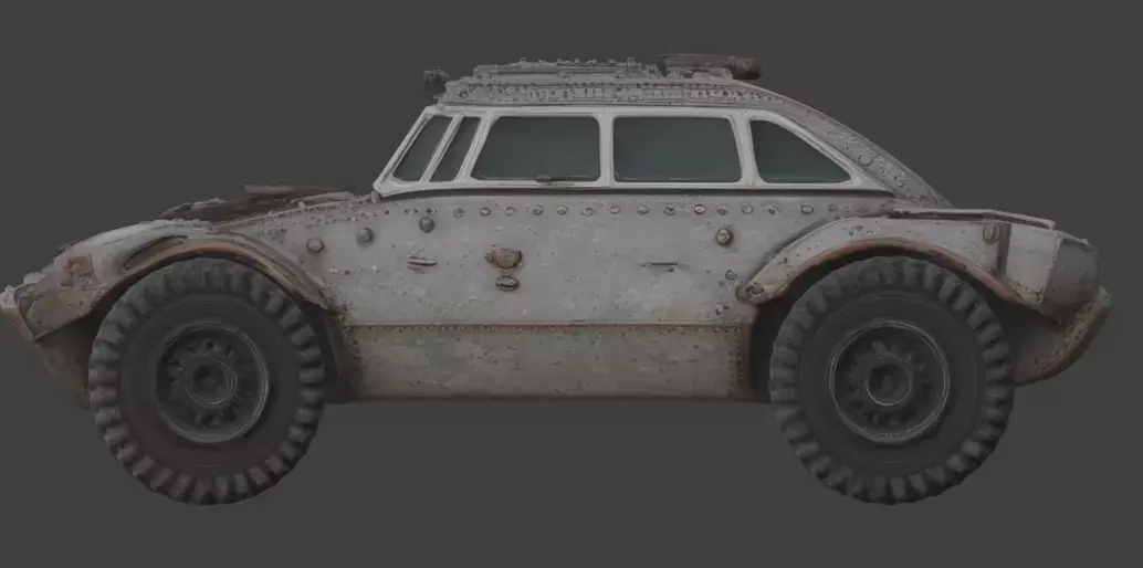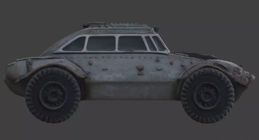Tagswasteland car, post-apocalyptic, 3D model, rusted vehicle, survival truck, exposed engine, PBR materials, offroad, weathered automotive, game ready, vintage muscle, rugged SUV