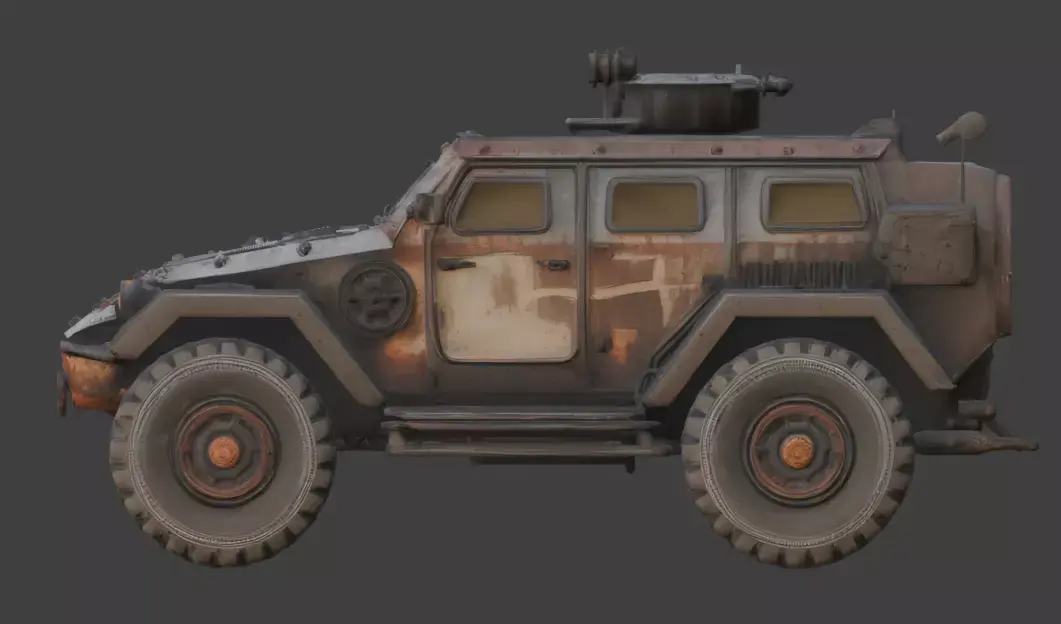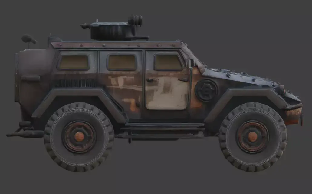Tagswasteland car, post-apocalyptic, 3D model, rusted vehicle, survival truck, armored vehicle, PBR materials, offroad, weathered automotive, game ready, tactical SUV, rugged pickup