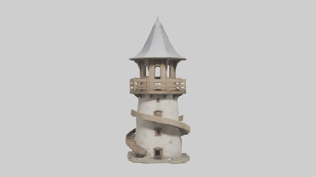 wieża strażnicza, model 3D, średniowieczna wieża, struktura obronna, wieża do nadzoru, drewniana wieża, kamienna wieża, platforma obserwacyjna, wieża widokowa, projekt fantasy, budowla historyczna, model wieży strażniczej, struktura obronna, wieża zamkowa, 3D wieża