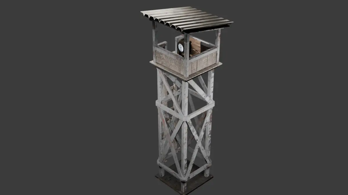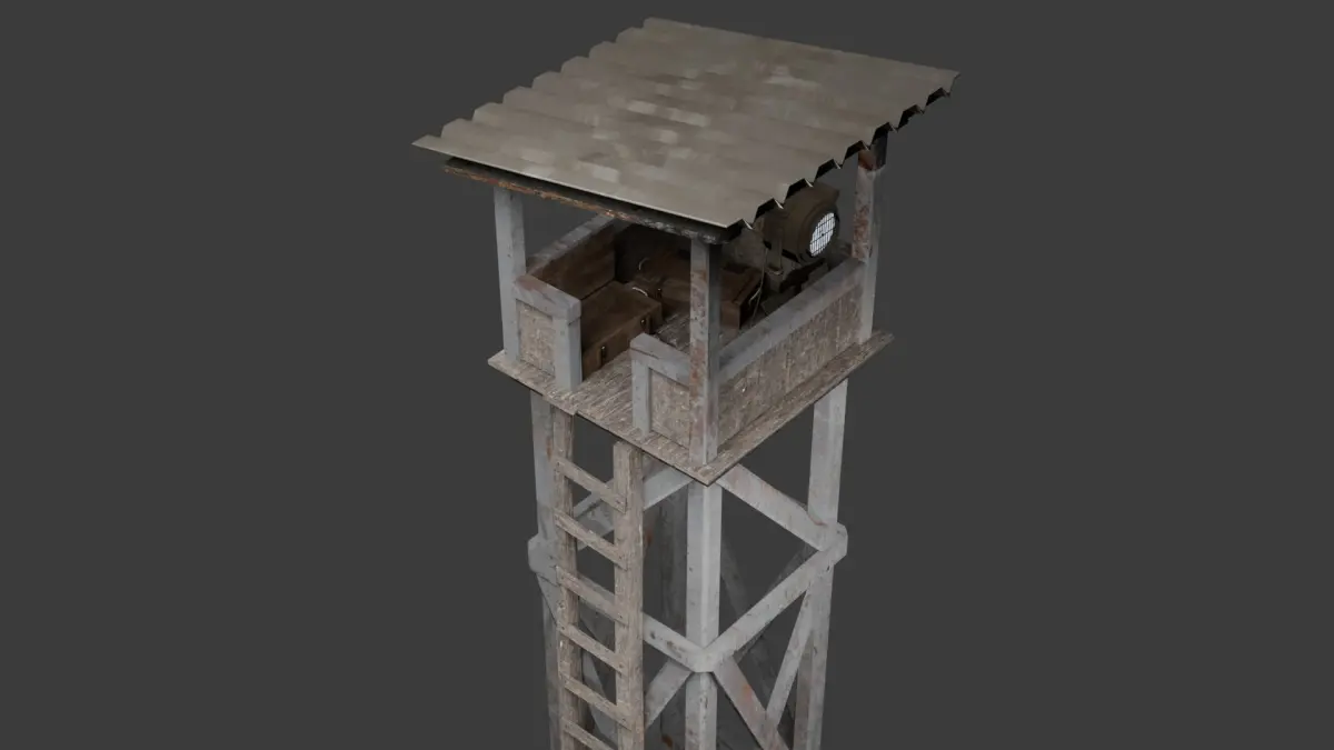 Detailed 3D model of a wooden watchtower equipped with two military crates and a functional spotlight. The tower features realistic textures and weathered details, perfect for use in game environments, military simulations, or architectural visualizations. Optimized for both close-up and distant renders, this model is ideal for adding depth and realism to your scenes.