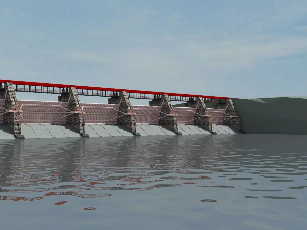 This is a river-blocking dam, featuring stone piers and dam structures as the main body, with a red maintenance bridge on the top, built against mountain rock walls. It is used to impound river water and regulate water level, serving as a water conservancy hub project with flood control and power generation functions.
