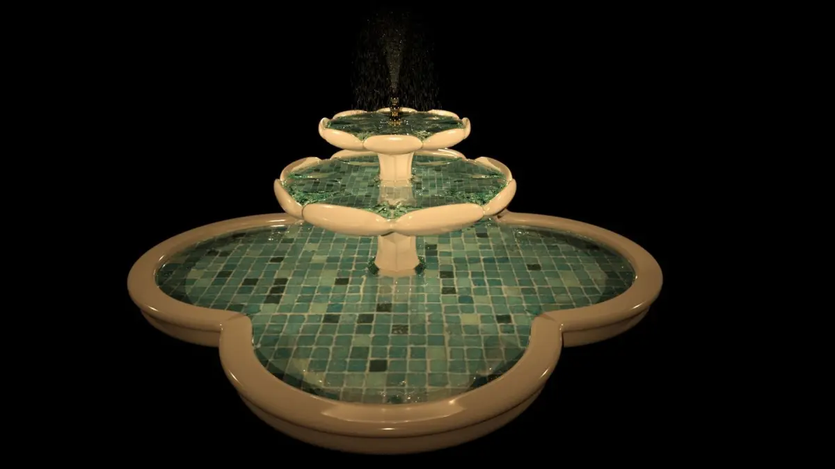 A Large three level water fountain finished in highly polished white marble and lined with small mixed blue tiles.The fountains top two pools are designed to look like open flower pettles allowing the water to to flow between each pettle downwards into the next pool.The fountain is crested with a polished brass water spray emitter.