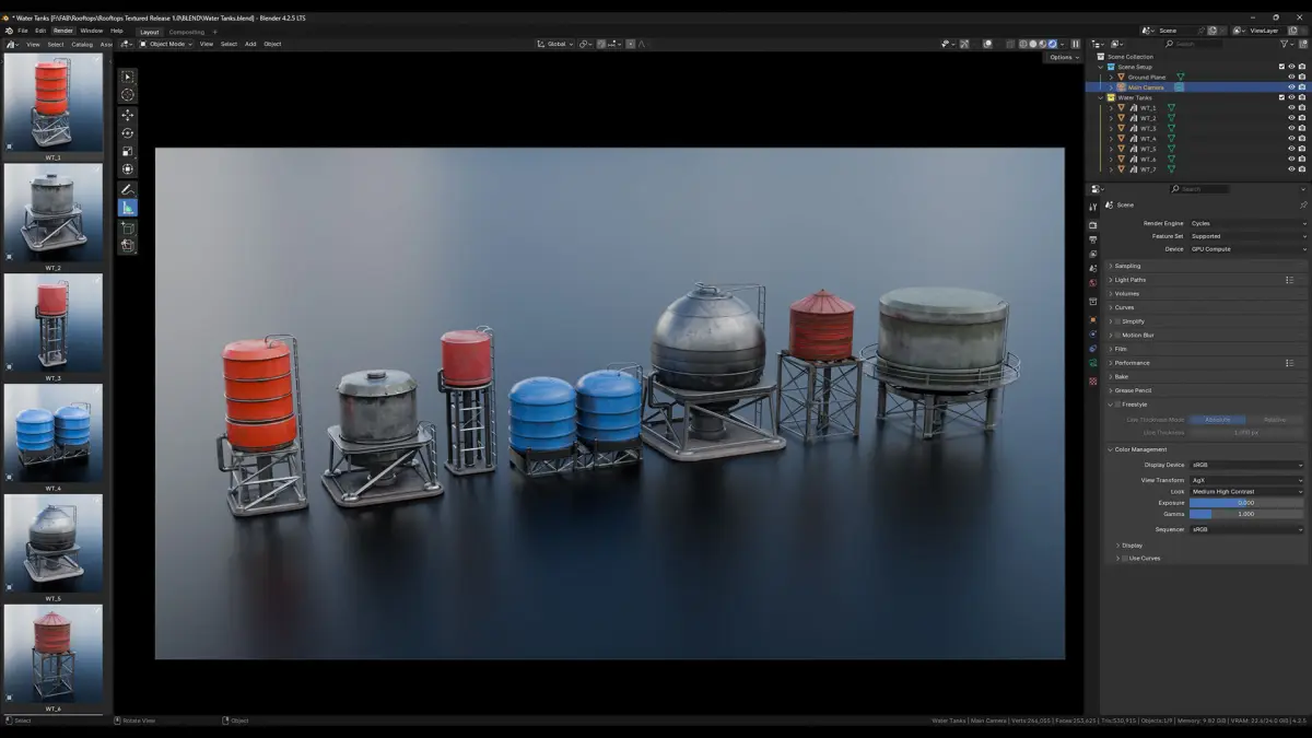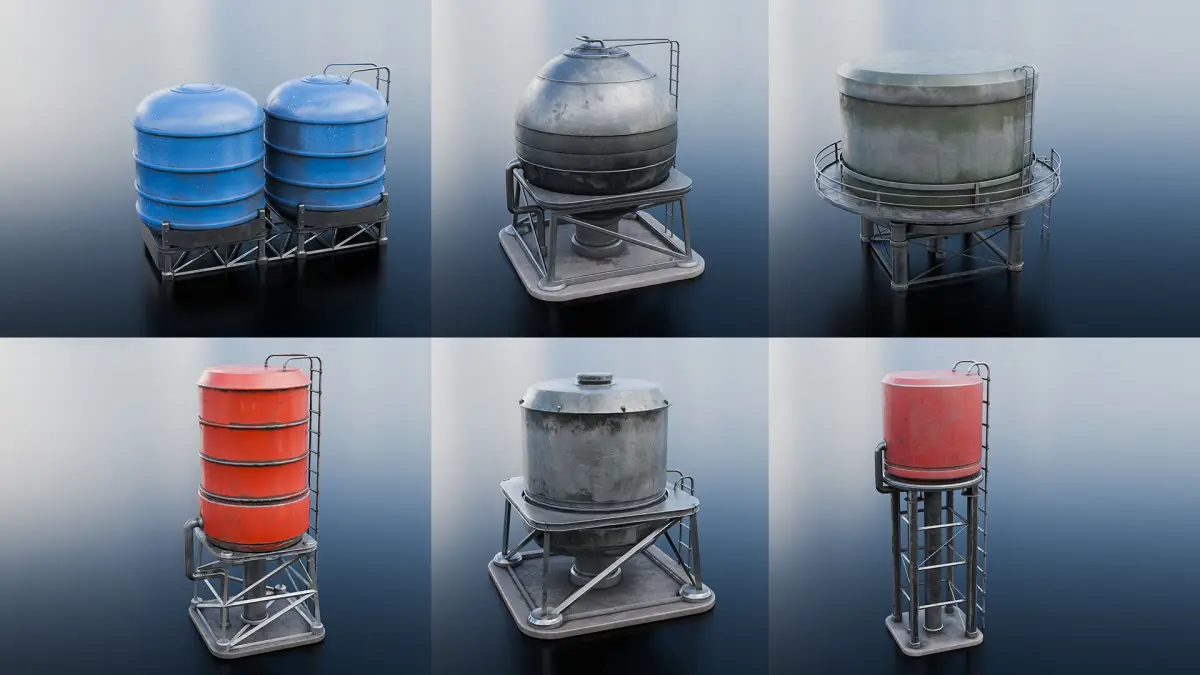 Pack of 7 stylized Water Tank models with hand painted textures.