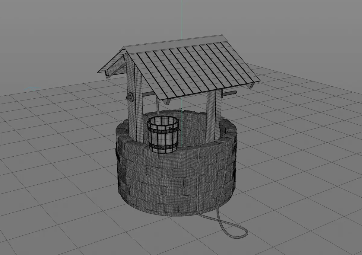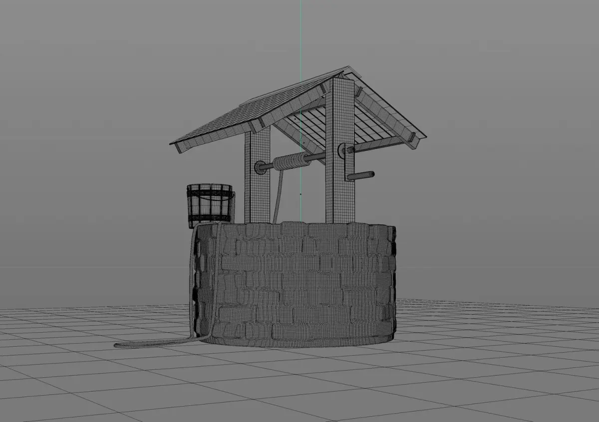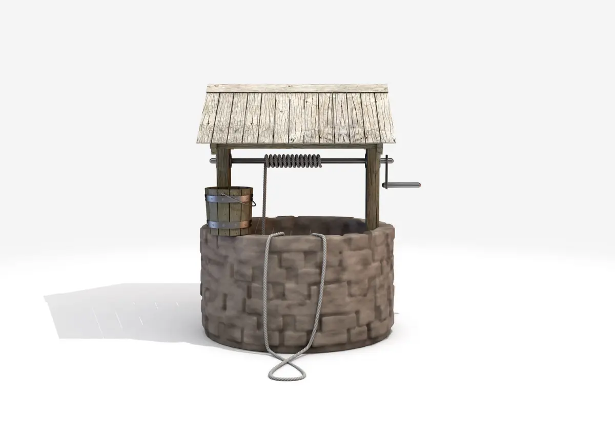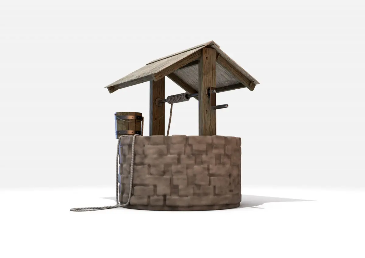 An old antique brick water well with a wooden roof and bucket attached to a rope. Created with volume builder in Cinema 4D.