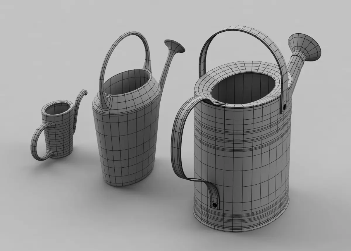 Here's a set of three different watering cans.The models are pretty light-weight, having less than 12.000 polys in total for 3 meshes.The presented cans were rendered with a subdivision of 2.All of them are UVed, without overlapping geometry.