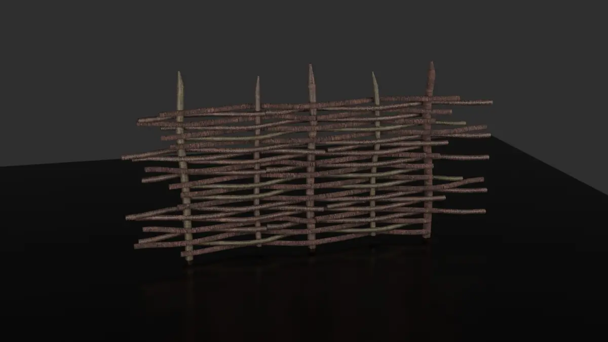 A wooden wattle fence. Can be used to decorate small villages or as barrier for military purposes.