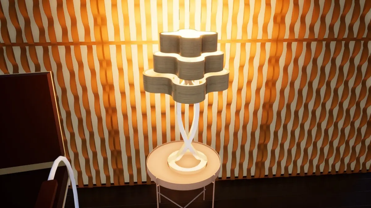 This lamp was an authorial creation. The design was developed from a hand-made sketch. This object was created in the 3D modeling program, Sketchup, and the images were generated in the program Twinmotion.