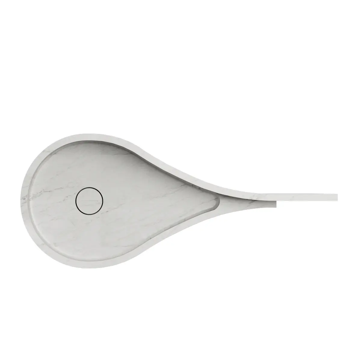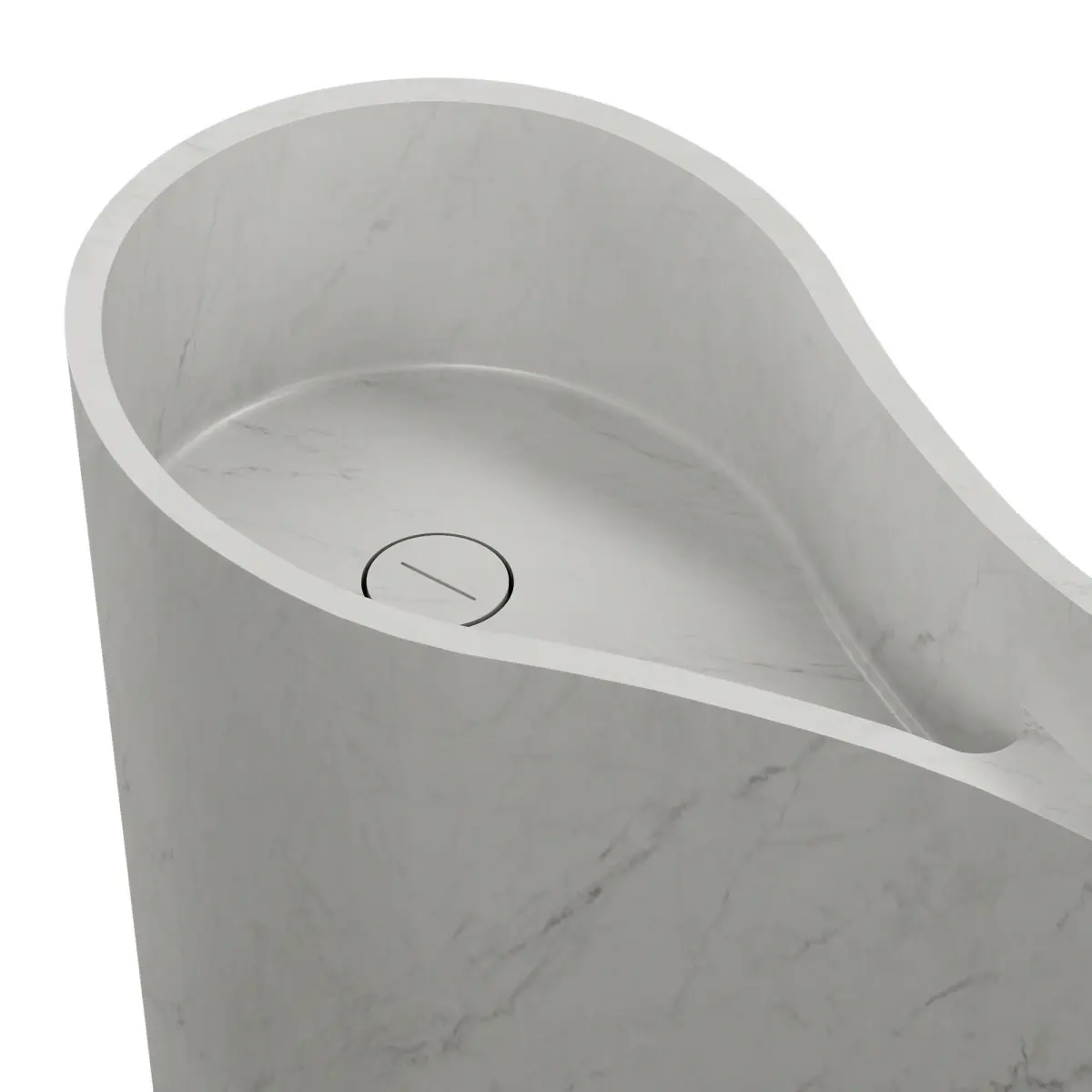 Freestanding marble sink with floor drainage complete with open plug, siphon and flexible hose. The energy of water finds an evident expression in this sink, a nature accentuated by the two flaps that do not overlap perfectly at the end, generating a practical support system for hand towels. The perfectly smooth surface of Wave is the result of the craftsmanship in marble processing and the perfect use of advanced machines, placed at the service of man to translate ideas and projects into masterpieces that alone characterize a space with style and uniqueness. The natural shades of the material make each freestanding sink unique and unrepeatable, giving it an exclusivity that transfers to the whole environment.