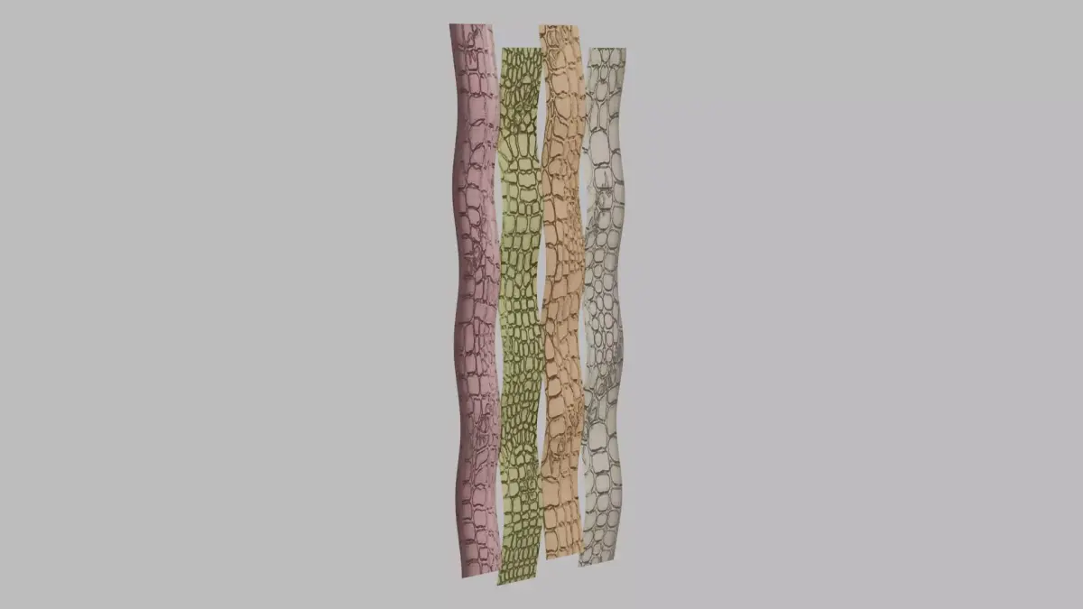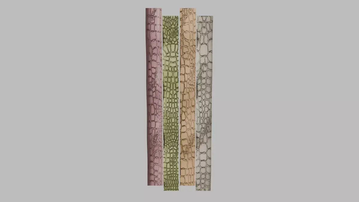 This wavy metal wall art features five textured panels inspired by alligator skin patterns. Each strip has a gently undulating surface that catches the light from every angle, creating depth and movement on the wall. The panels are arranged in an alternating pattern, showcasing a soft palette of pastel tones including red, yellow-green, tan, and brown. The mix of metallic shimmer and subtle color gives this piece a distinctive modern look with organic flair—perfect as a statement accent for contemporary or eclectic interiors.
