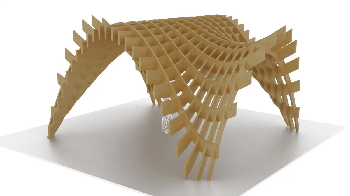 A Wavy Wooden Waffle Structure Pergola, with two sets of perpendicular wooden beams, the wooden beams are interlocked with each other with slits and grooves in each beam section, the beams network form a wavy smooth surface with four openings and the structure is fixed to the ground in four locations, the model was created using computational parametric tools to achieve the most accurate geometry with clean details, it could be used for architectural render purposes outdoors, and also for Landscaping and urban landmarks.