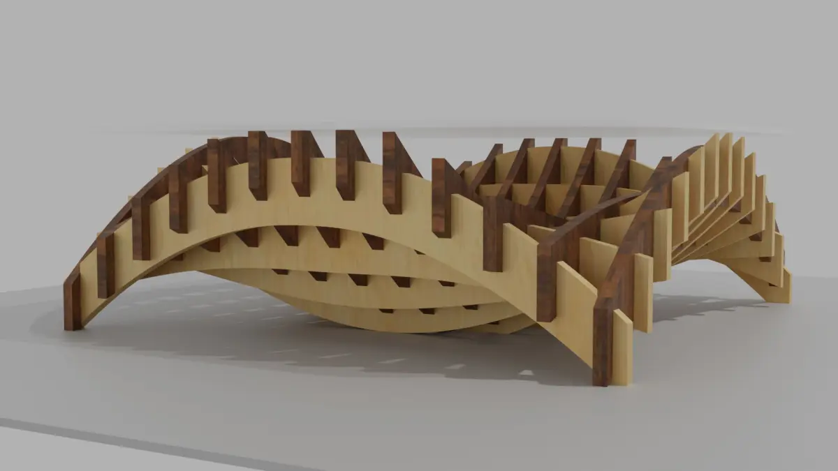 A Coffee Table with Wooden Waffle Structure in a Wavy form, with a Flat glass panel on top of the waffle network Beams, the model has two groups of perpendicular wooden beams that are interlocked with slits, the model was created using computational parametric tools to achieve the most accurate geometry with clean details, it could be used for architectural render purposes indoors, and also for interior design, furnishing and decoration.