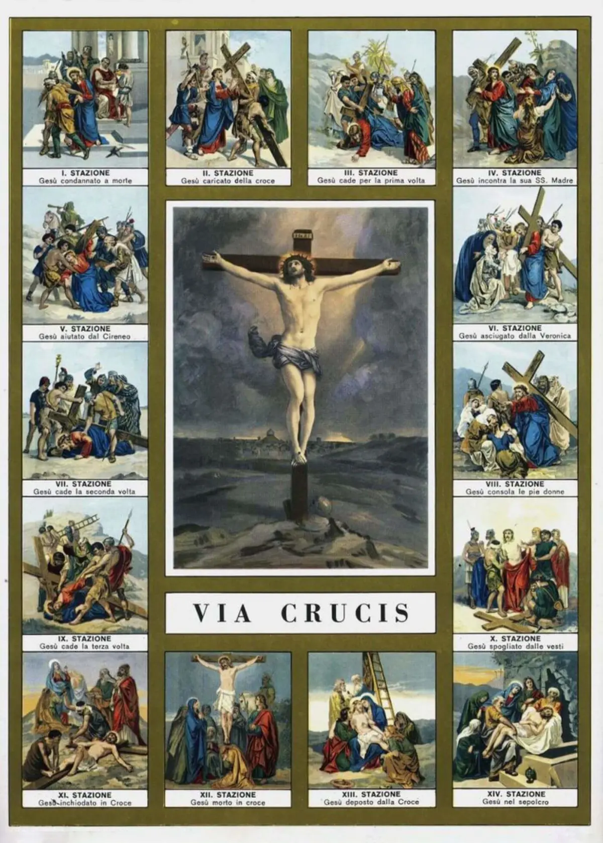 VII . STAZIONE Gesù cade la seconda volta 7-VII . STATION Jesus falls the second timeVIII . STAZIONE Gesù consola le pie donne VIA CRUCIS 8-VIII. STATION Jesus consoles the pious women VIA CRUCISIX . STAZIONE Gesù cade la terza volta 9-IX . STATION Jesus falls the third timeX . STAZIONE Gesù spogliato dalle vesti 10-X . STATION Jesus stripped of his clothesXI. STAZIONE Gesù inchiodato in Croce 11-XI. STATION Jesus nailed to the CrossXII. STAZIONE Gesù morto in croce 12-XII. STATION Jesus died on the crossXIII. STAZIONE Gesù deposto dalla Croce 13-XIII. STATION Jesus taken down from the CrossXIV. STAZIONE Gesù nel sepolcro 14-XIV. STATION Jesus in the tomb