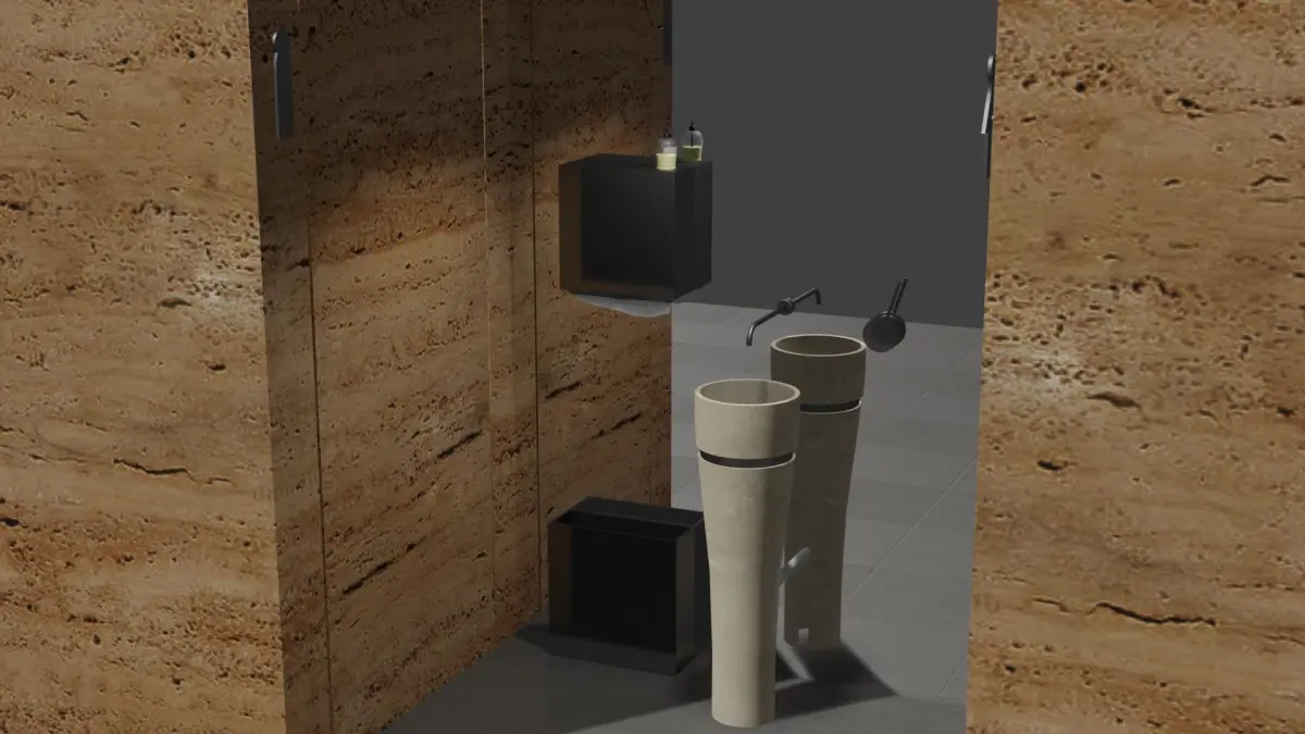 This model is based in a real life bathroom from my workplace.The stone in the wall is travertino and the washbasin is botticino.It can be made in real life.Any required formats, please contact me.