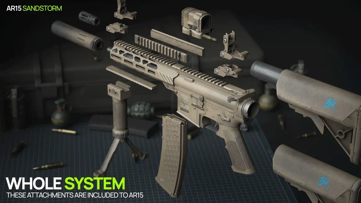 Game-Ready PBR(Metal-Rough)AR15 with 9 attachments(Silencer, Suppressor, Iron Sight(folded, unfolded), Holographic sight, Tactical Grip, Stock(folded, unfolded), pikatini plane).