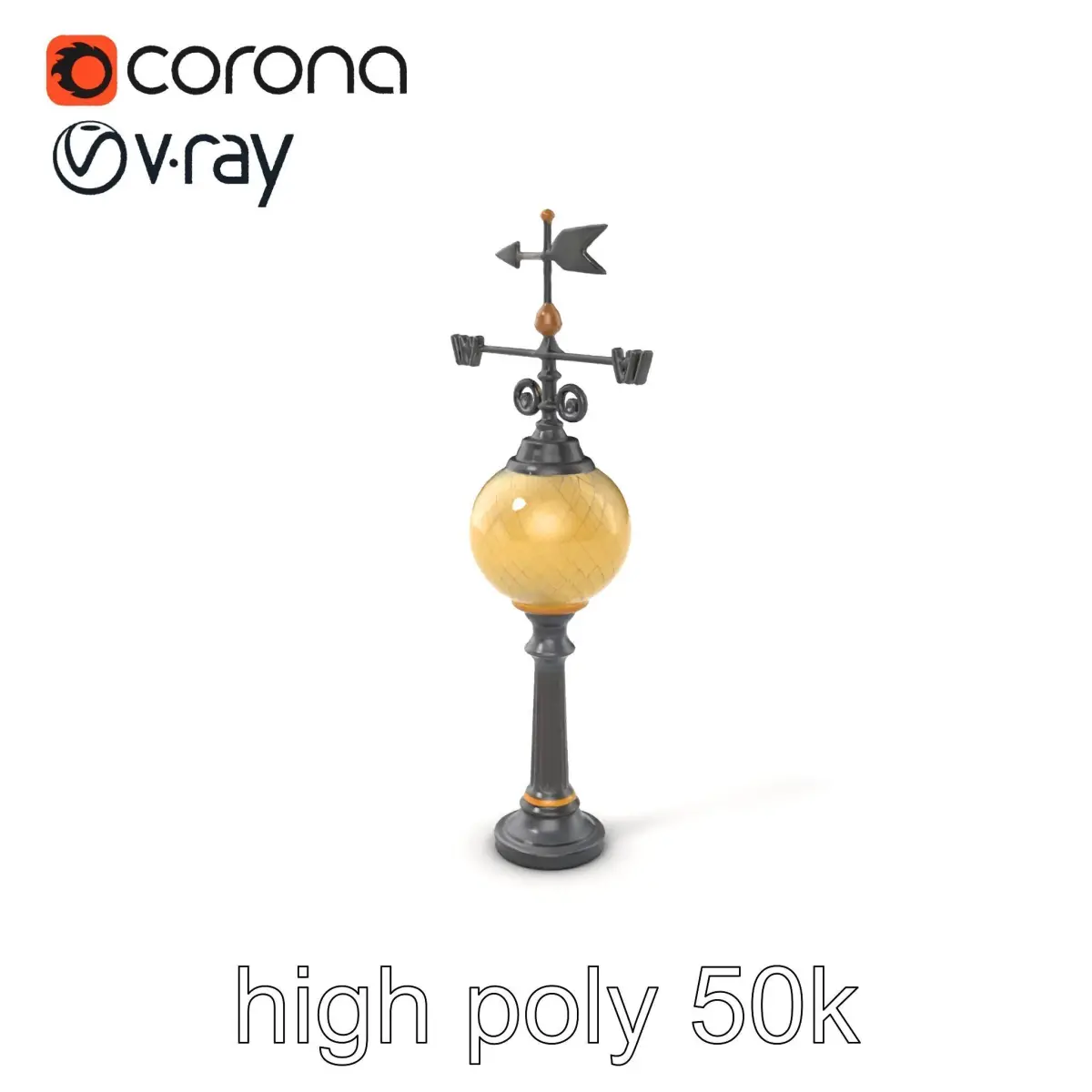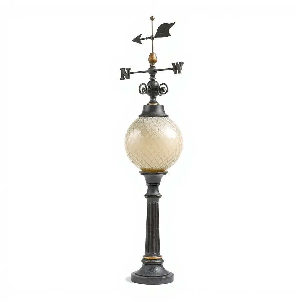 This elegant weather vane street lamp model is ideal for historical cityscapes, modern urban designs, and decorative park environments. Its detailed ornate design features a pattern-decorated glass globe and a classic weathervane topping, adding an aesthetic flair.