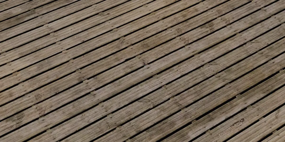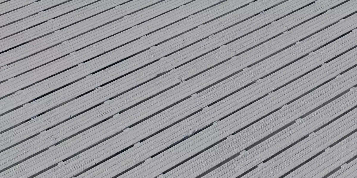 Narrow weathered slats with spacer blocks, grain wear, and subtle staining for authentic boardwalk mood.