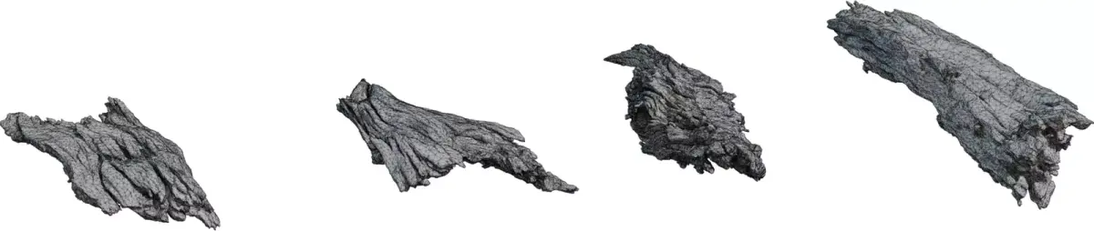 This asset pack contains a long, dramatic driftwood log and multiple broken wood fragments scanned from real weathered tree remains. The main log features layered, splintered fibers, deep cavities, and sharp overhanging edges, making it ideal as a hero foreground prop, natural bridge, or barrier in environments. Smaller pieces include jagged standing shards and knotted chunks that work perfectly as forest debris, shoreline clutter, or diorama accents. High‑resolution PBR textures capture subtle color variation from sun‑bleached gray to warm interior browns, along with cracks and dirt staining for believable close‑up shots. Geometry is optimized with clean triangulated topology, preserving silhouette detail while staying efficient for real‑time engines and scattering. UVs are neatly unwrapped for straightforward material setup, lightmapping, and instancing in major DCC packages and game engines. This driftwood pack suits games, cinematics, archviz exteriors, and nature scenes that need realistic organic wood forms with minimal setup.
