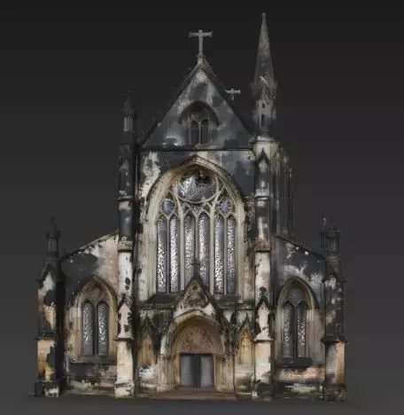 Heavy Soot Staining The most defining feature of this asset is the realistic weathering. The light-colored limestone facade is heavily stained with black soot, mold, or pollution. This grime runs down the walls and collects under the arches, giving the building a foreboding, haunted look.