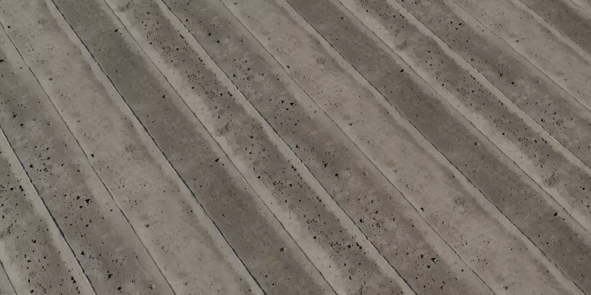 This is a high quality 8K seamless PBR material of a weathered precast concrete panel surface. These long concrete panels are commonly used in industrial building walls, shuttering formwork concrete casting, parking structures, factory sheds, metro pillars, bridge shuttering plates, retaining walls, tunnel interiors and modern minimal architecture. Each panel has visible linear construction joints, surface air pockets, pinholes, fine cracks and raw cement texture – delivering a perfectly realistic industrial concrete look. The natural color variation and dark patches are preserved to maintain full authenticity.