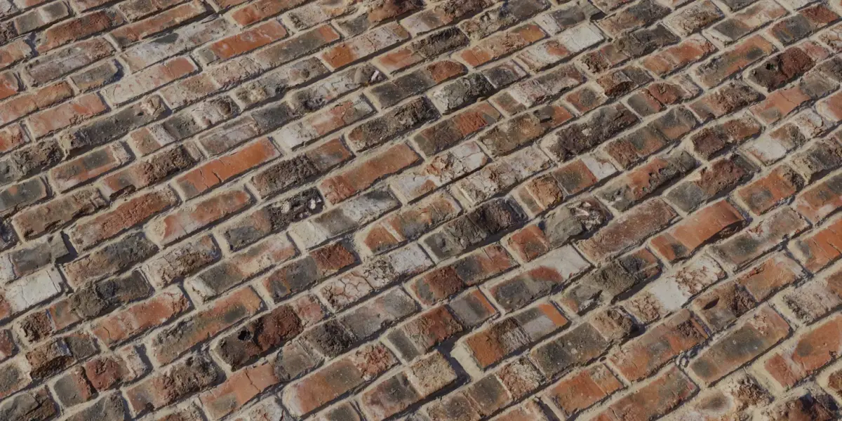 A seamless, photorealistic reclaimed brick material featuring hand‑pressed bricks with spalls, soot burns, salt efflorescence, and sandy mortar bulges for gritty period‑correct realism in games, archviz, and film sets. Warm terracotta through charcoal variation tiles cleanly yet keeps organic breakup for hero closeups and large façades under HDRIs or direct sun without obvious repetition. Height and normal maps retain chipped edges, cavities, and crumbly mortar for strong parallax and tactile roughness at grazing light angles across engines.