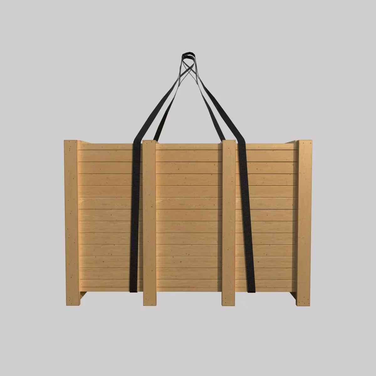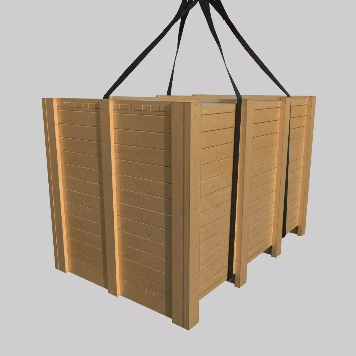 This model depicts two heavy wooden crates suspended with a flat web sling system, demonstrating safe load-lifting configurations used in factory, warehouse, and crane training simulations. The asset is ideal for VR/AR safety training, lifting equipment visualization, and industrial simulation environments.