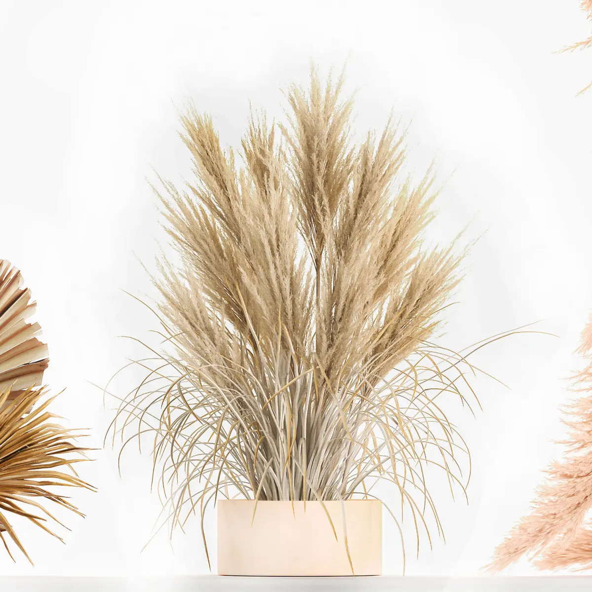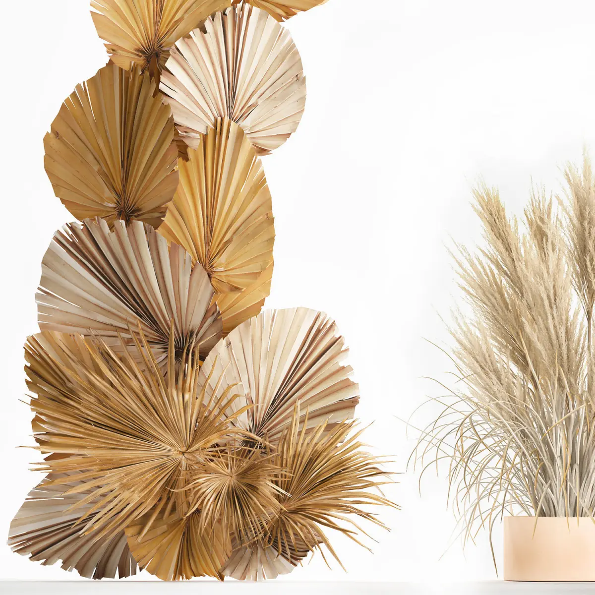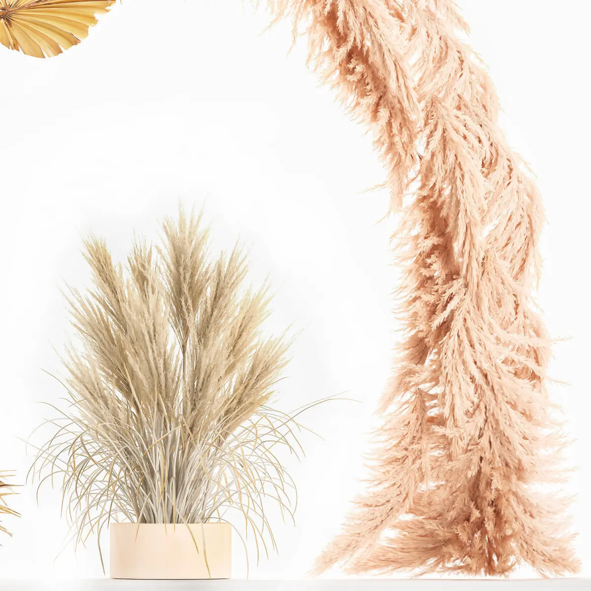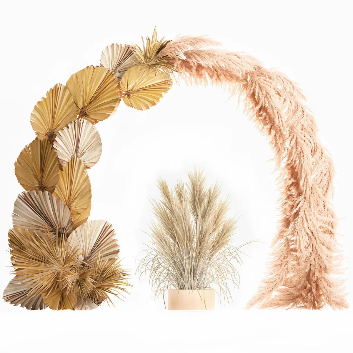 Wedding arch made of dry reeds and palm leaves for decor and interior, landscape design. Wedding decor, decor for weddings, wedding arrangement, installation, decoration.Dried flowers decor - branches, pampas grass.Bouquet of dry bleached flowersPhragmites australis - Common reed.Dry reed - Dry white reed.Dried flowers, dry grass.dry, stabilized, paintedCortaderia, pampas, pampas grass.