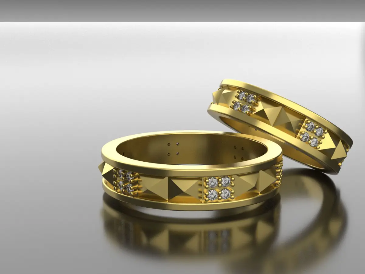 Pyramid Shape: The band incorporates a series of pyramid shapes, which can be arranged in a variety of ways. Some designs feature a single row of pyramids, while others have multiple rows or a more intricate pattern.Diamond Setting: Diamonds are typically set into the pyramid shapes, either as pavé settings (small diamonds closely set together) or with larger diamonds in a prong or bezel setting.Style