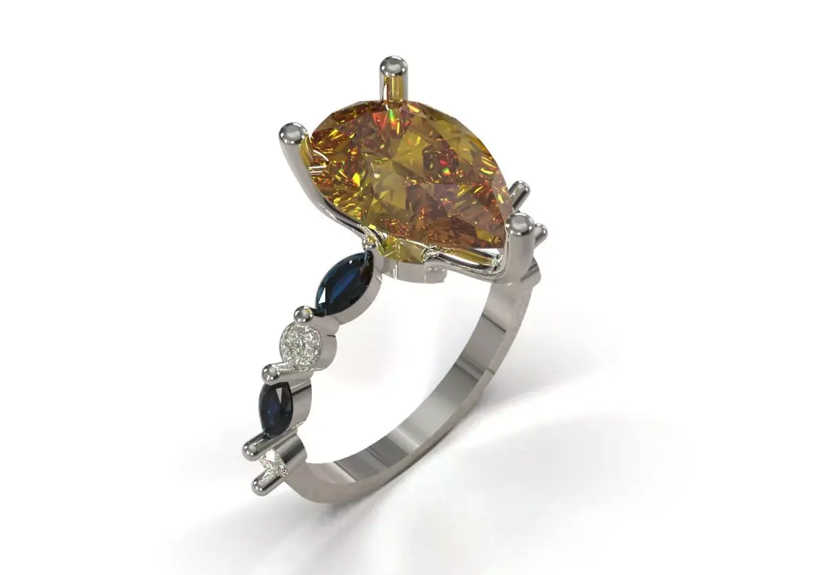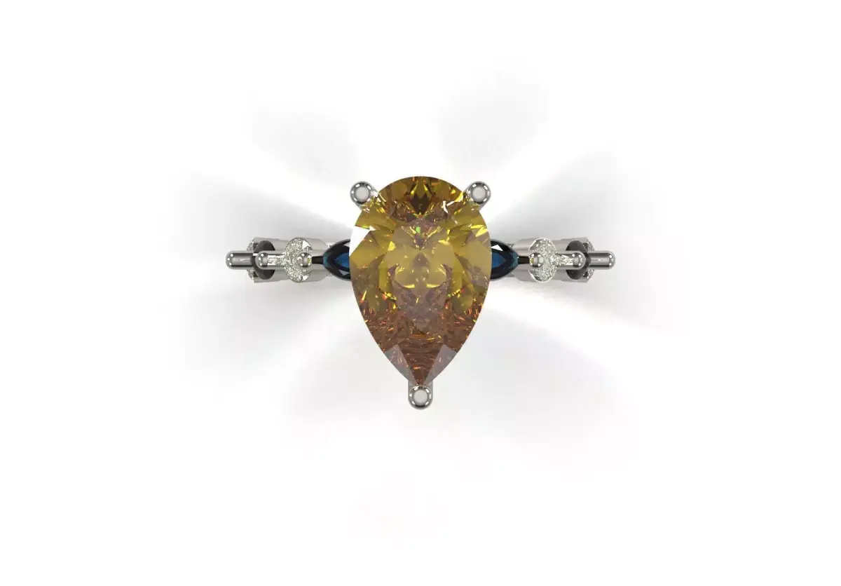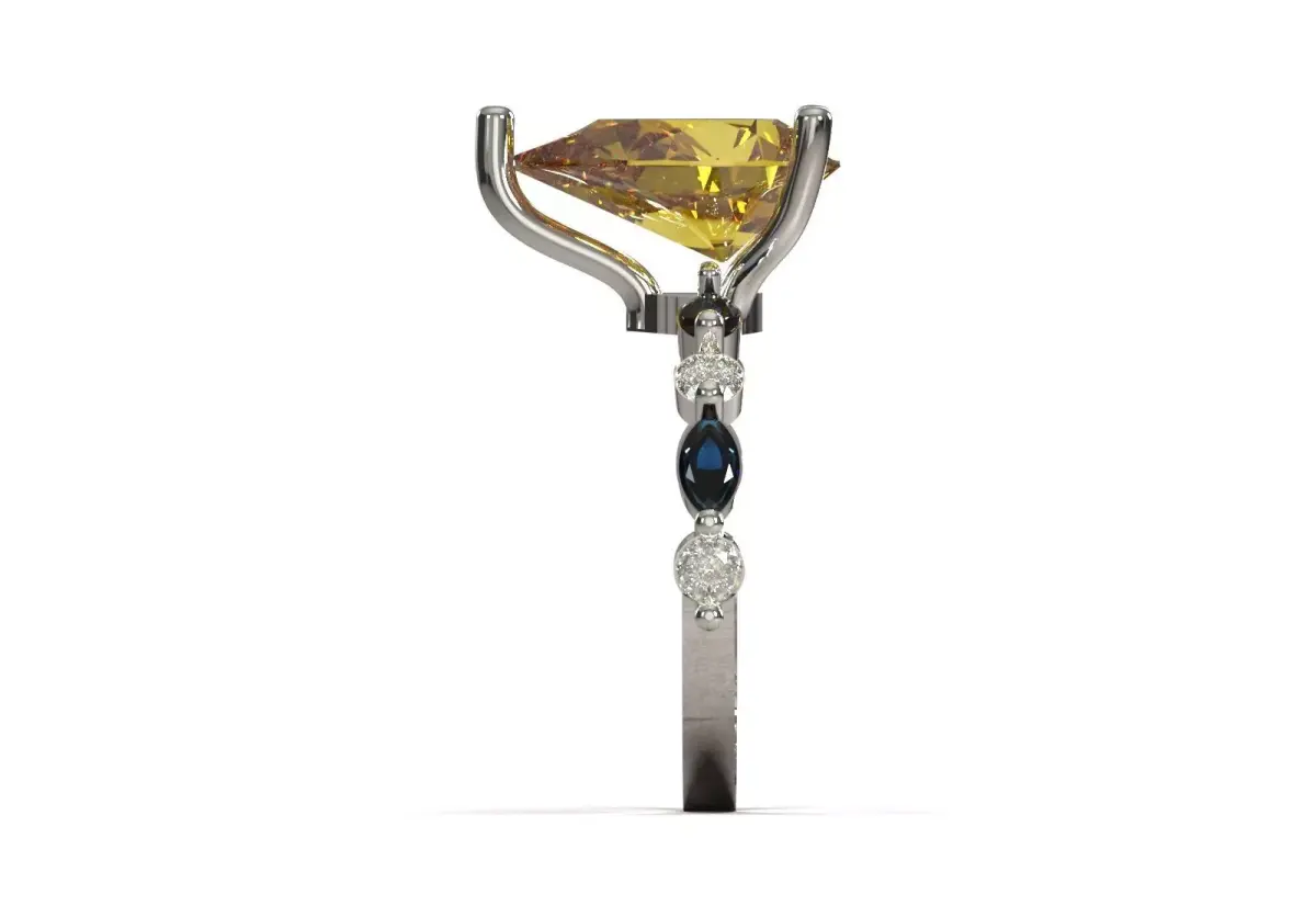 | Feature | Technical Description || :--- | :--- || Product Type | Fancy Solitaire Ring/Collection || Product Code | JR00326 || Center Stone | Pear Cut in large size (possibly yellow quartz or yellow/brown fancy diamond in the rendering). || Side Stones | Dark (blue/sapphire) Marquise stones and white Round stones. || Setting | Main jewel with Long and sturdy prongs; Side jewels with Delicate prongs on the stirrup. || Stirrup design | Asymmetrical: Side jewels are installed on only one side of the stirrup, creating a curved effect. || Dominant style | Artistic, formal, statement. |