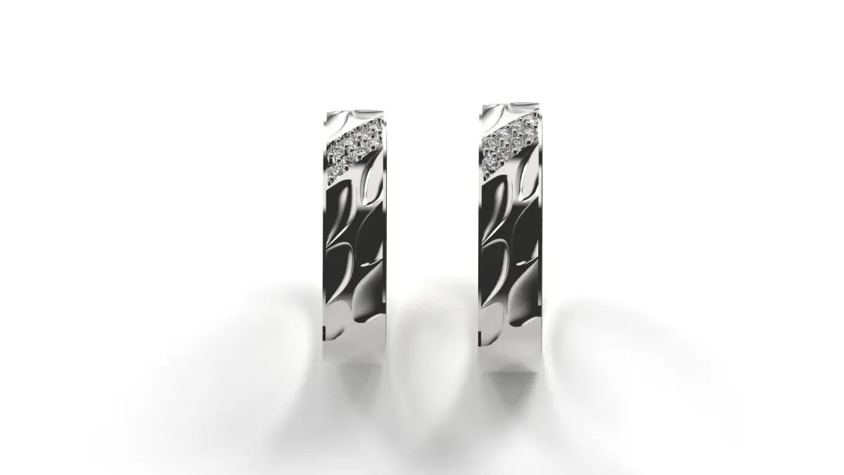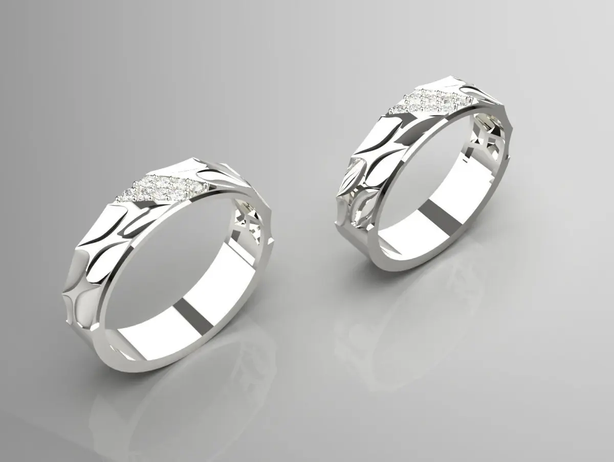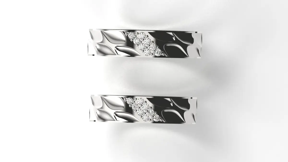 These are a pair of matching rings, likely wedding or engagement bands, crafted from a shiny metal—probably silver or white gold. The rings feature an elegant, modern design with a textured, petal-like pattern engraved on the outside. Each ring is adorned with a row of small, sparkling gemstones, possibly diamonds, which are set along a part of the top surface, adding a touch of luxury and brilliance to the design. The overall look is contemporary, sophisticated, and stylish.