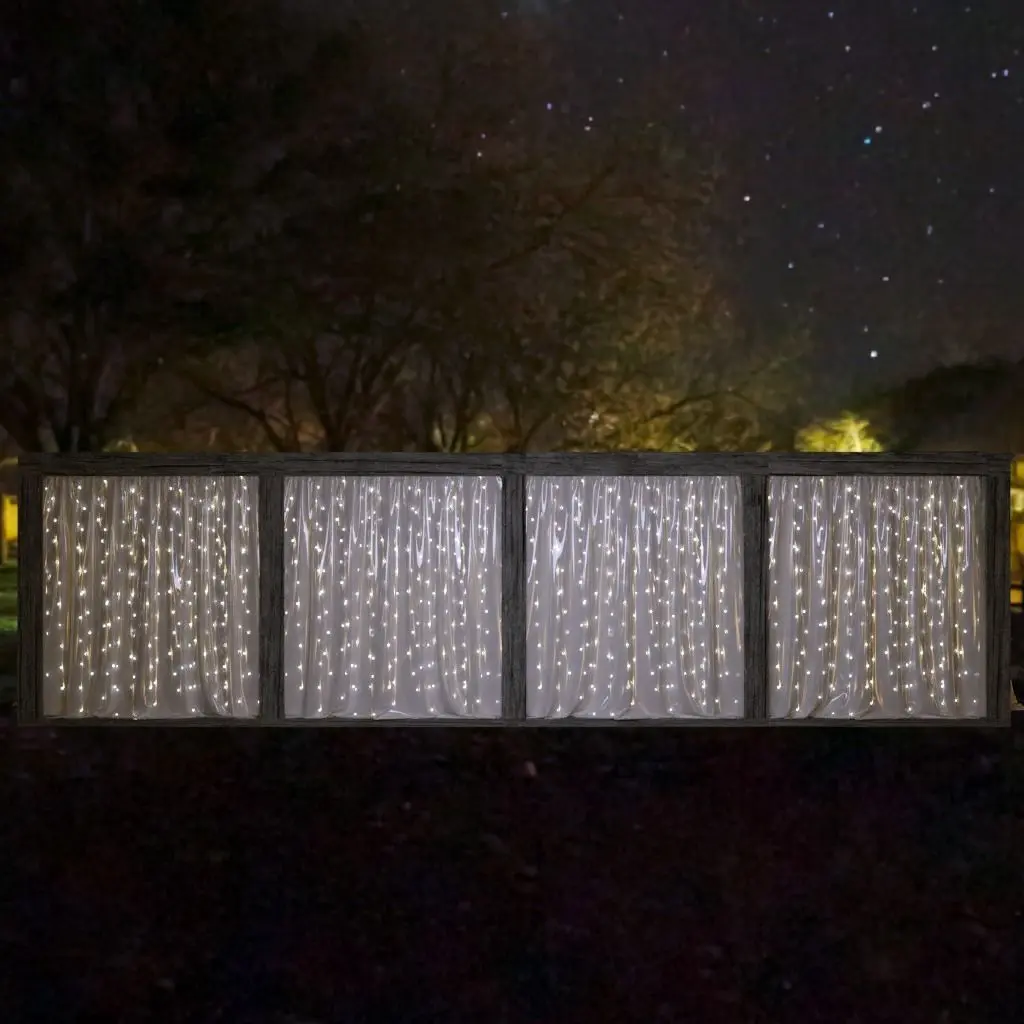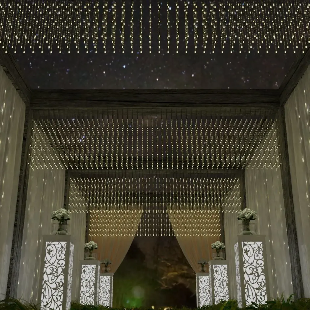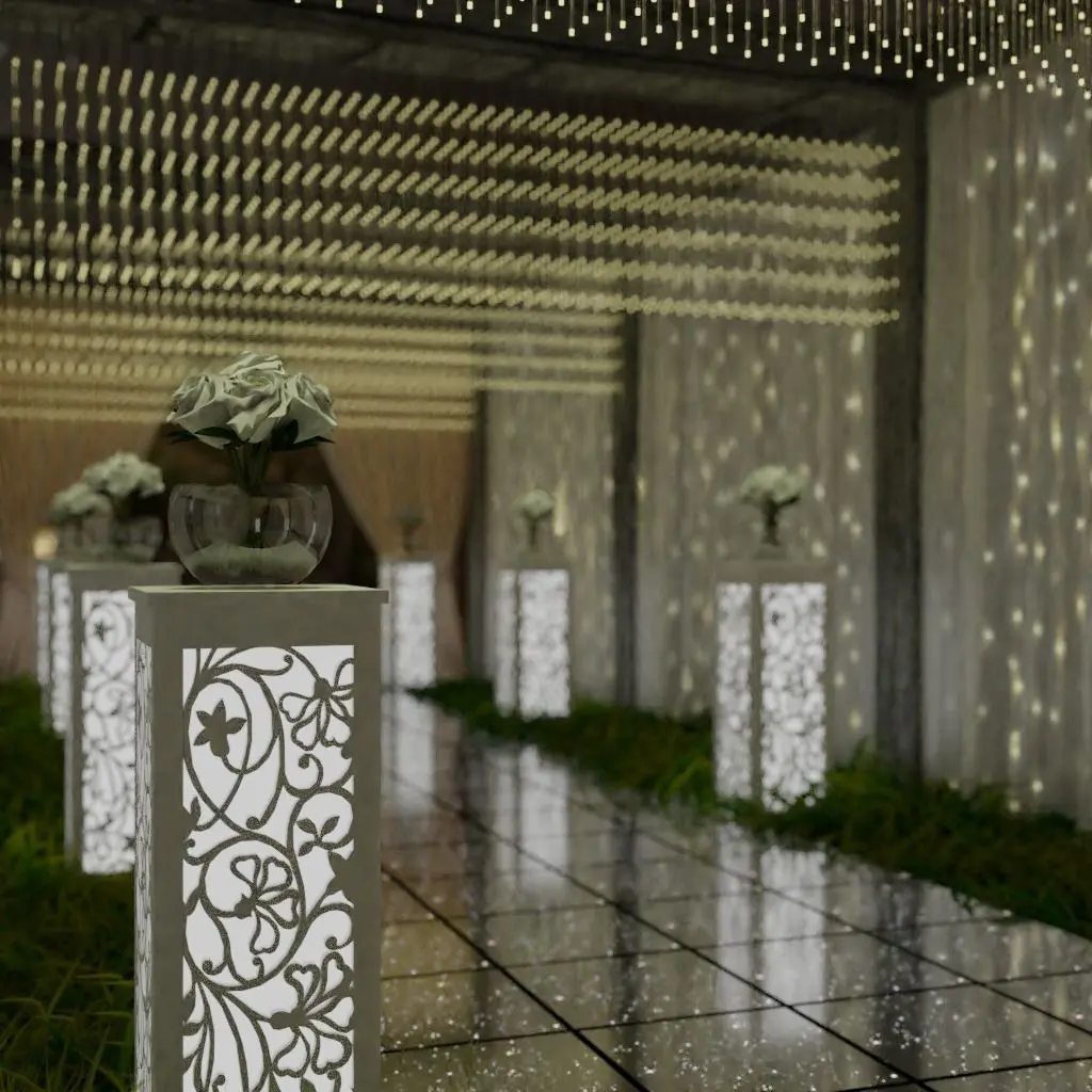 Outdoor wedding entrance containing: plexi flooring, Curtains & Flower pots.