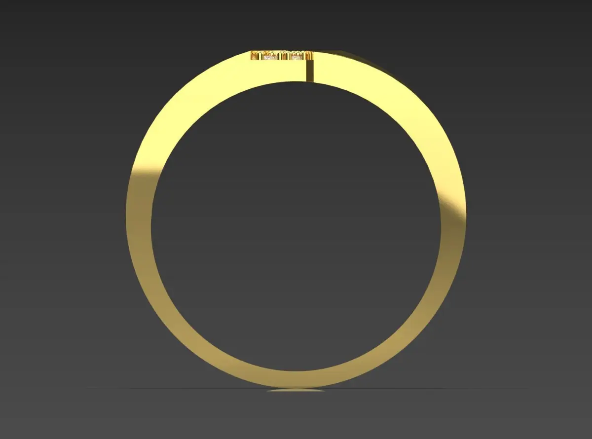 This image features a luxurious gold ring with a sleek, modern design. The ring has a broad, polished band with sharp, clean edges. At the top, there's a small cluster of six brilliant-cut diamonds set in a rectangular arrangement, adding a touch of elegance and sparkle. The overall design is contemporary and stylish, blending boldness with delicate detail.