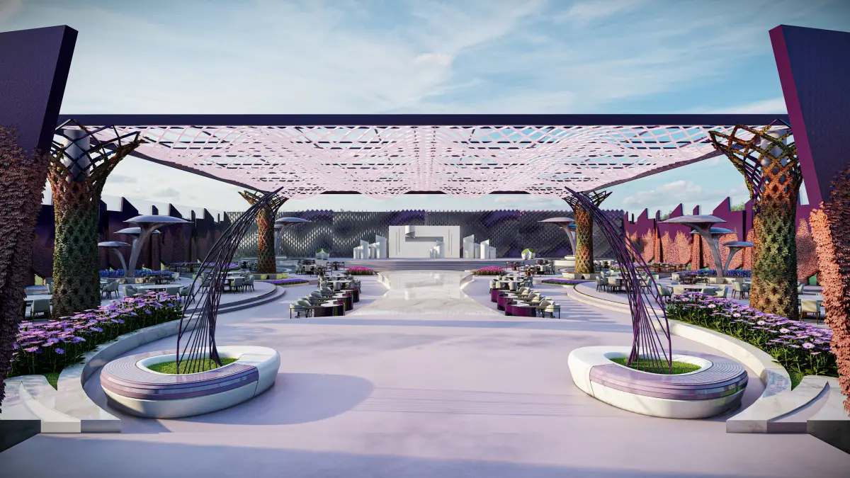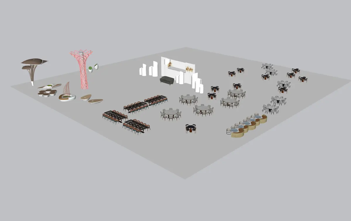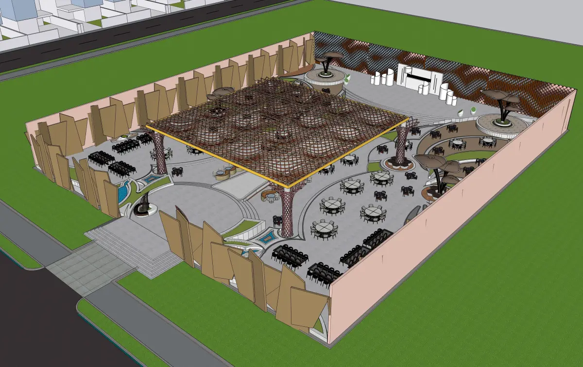 This is a high-quality SketchUp 2025 model of a modern outdoor wedding hall. It includes detailed architecture, full furniture, event elements, and surrounding environment — ideal for visualizations, event design, and presentations.