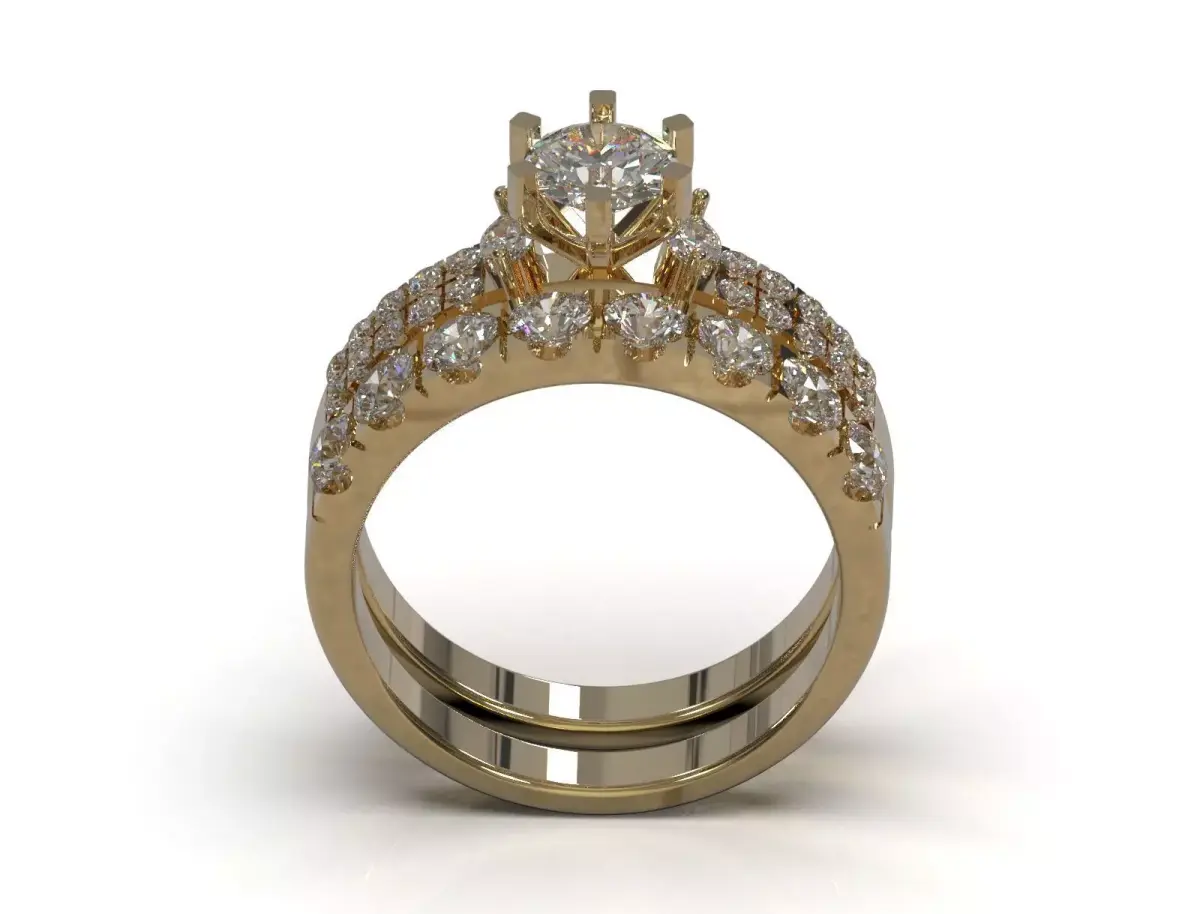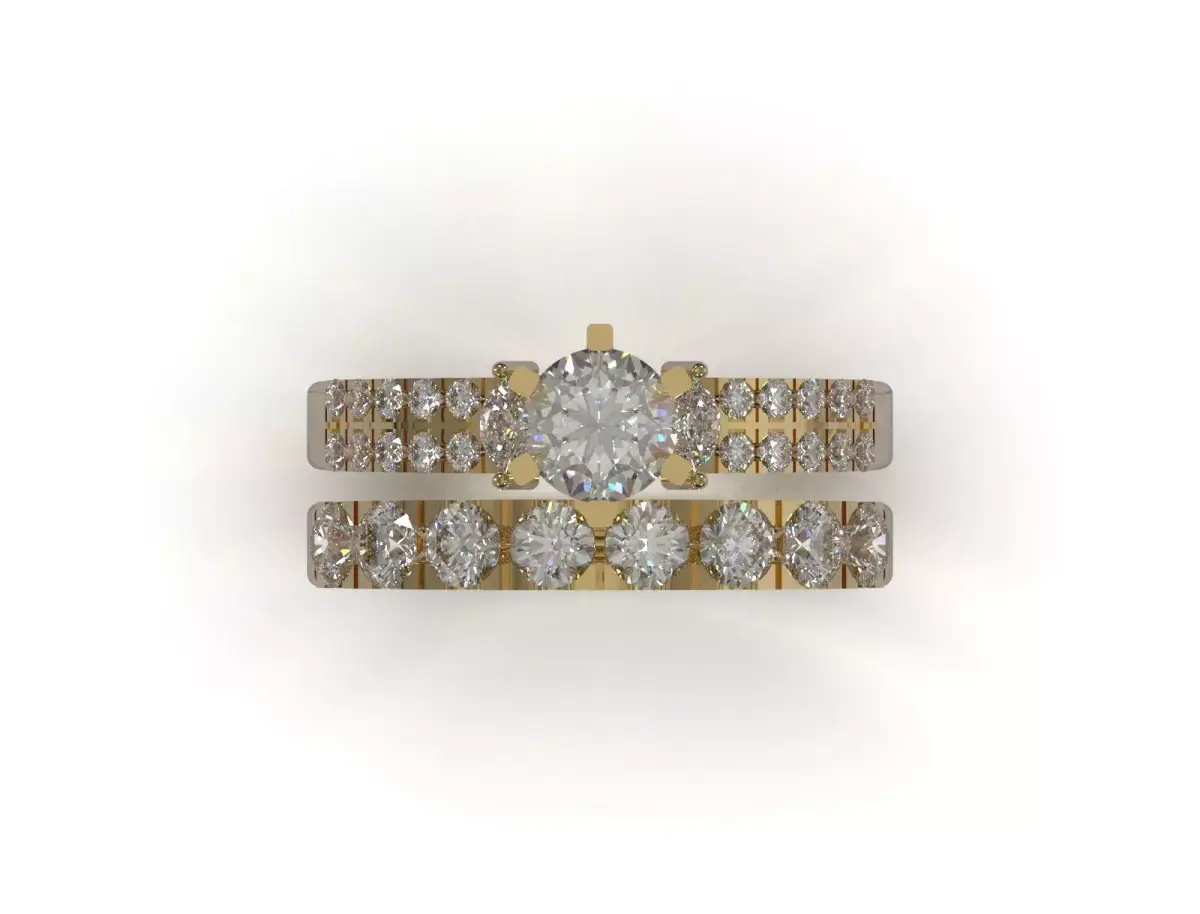 This style (single-row with stone-bearing stirrup) never goes out of style and is always one of the best-selling models in the engagement and wedding jewelry market. The combination of two rows of stones on the main ring and one row on the ring creates a beautiful visual contrast that makes the center stone appear larger.