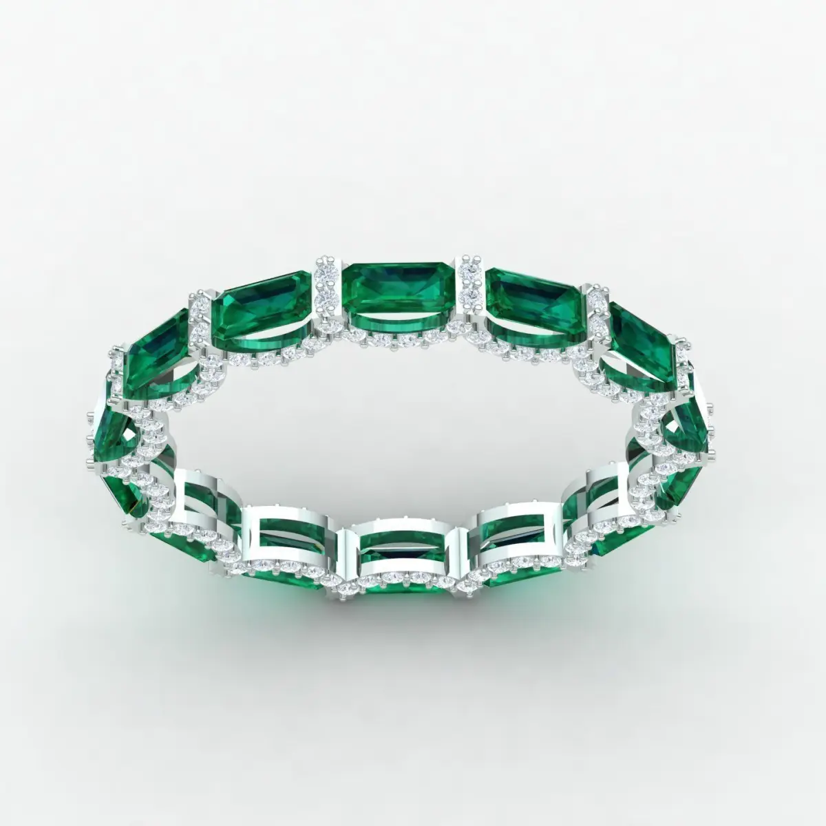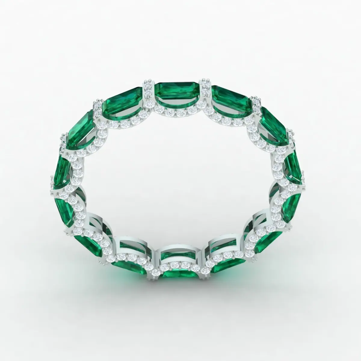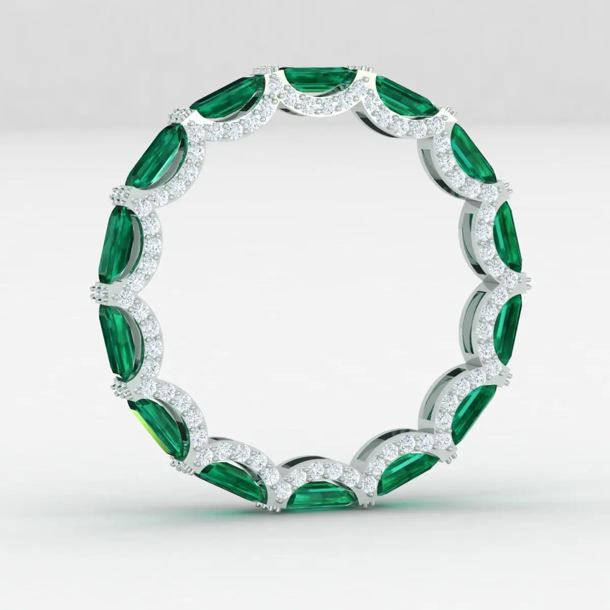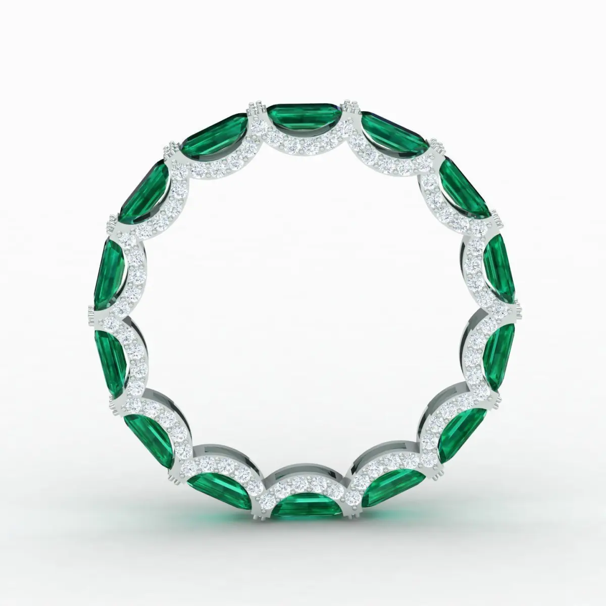 The women's ring is light weight and full of gems. The size of the ring is 55 and its weight is 2.35 grams with 18 karat yellow gold.Number and size of gems:14 emeralds, size 2 x 4 mm168 round gem, size 0.9 mm