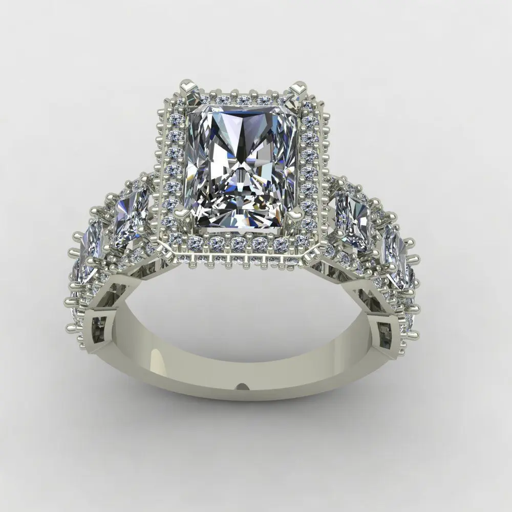 Women's wedding ring. Ring size 7 is US standard. Weight about 6 grams with 18 karat yellow gold. The main stone is 9.66 x 6.88 x 4.42 mm. There are 3 radiant stones of 3 x 4 size on each side (6 pieces in total). The halo and around the radiant stones are covered with 1 and 1.2 mm round stones.The number of round stones is as follows:132 pieces of 1 mm size28 pieces of 1.2 mm