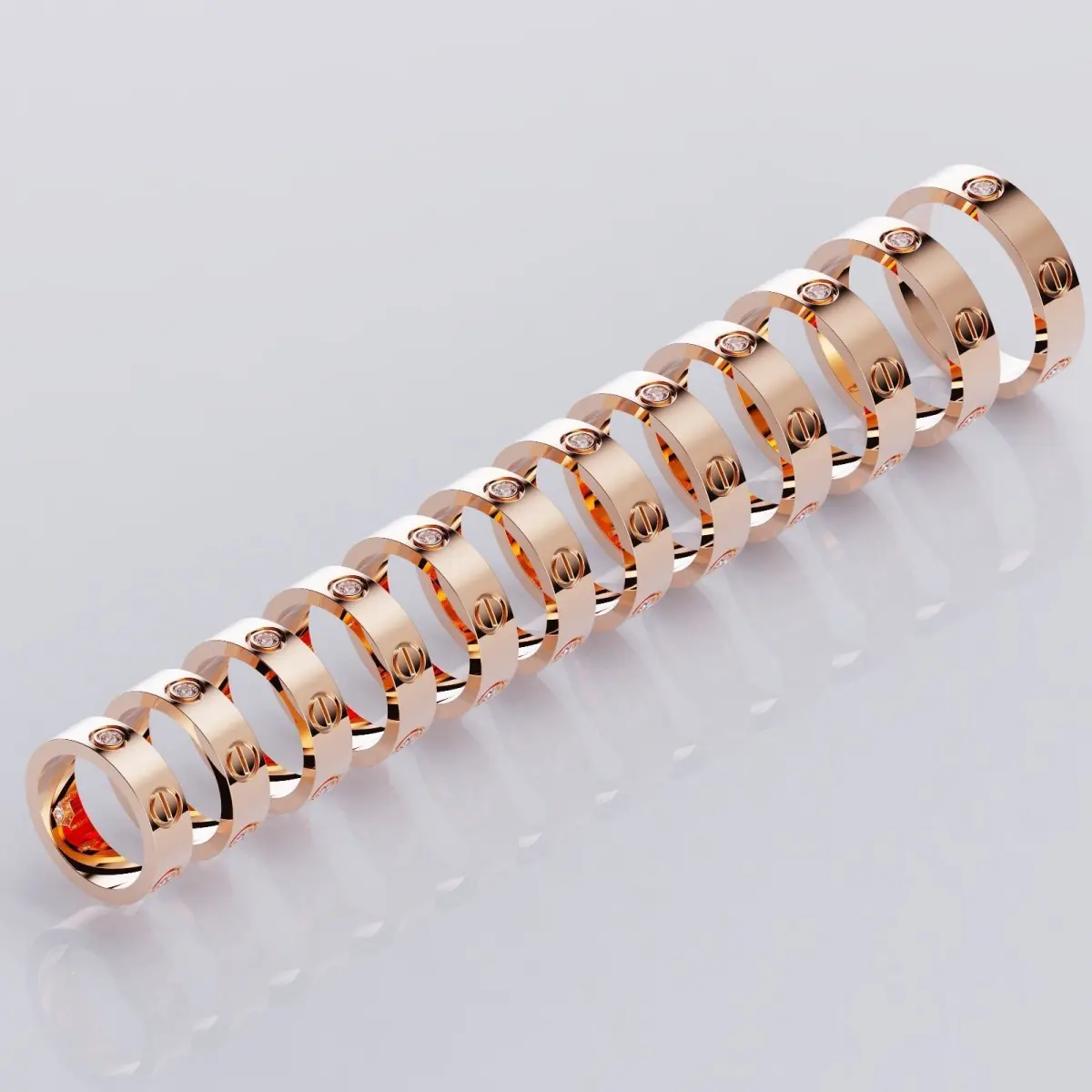 This collection of rings is ready for 3D printing.Ring sizes 16 16.5 17 17.5 18 18.5 19 19.5 20 20.5 21 mm. Approximate weight of rings by size(GOLD 14K): 16mm-7.06g 16.5mm-7.27g 17mm-7.49g 17.5mm-7.71g 18mm-7.92g 18.5mm-8.14g 19mm-8.35g 19.5mm-8.57g 20mm-8.78g 20.5mm-8.99g 21mm-9.21g. Width: 5.6mm Round stones: 3 (2.7mm).