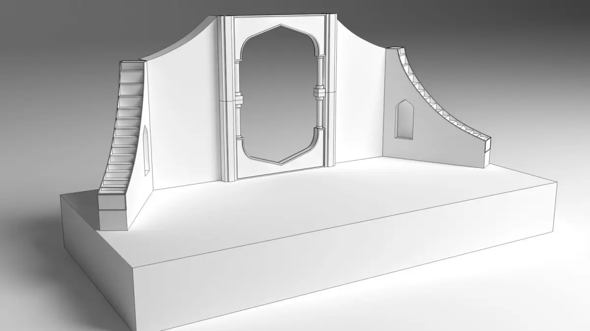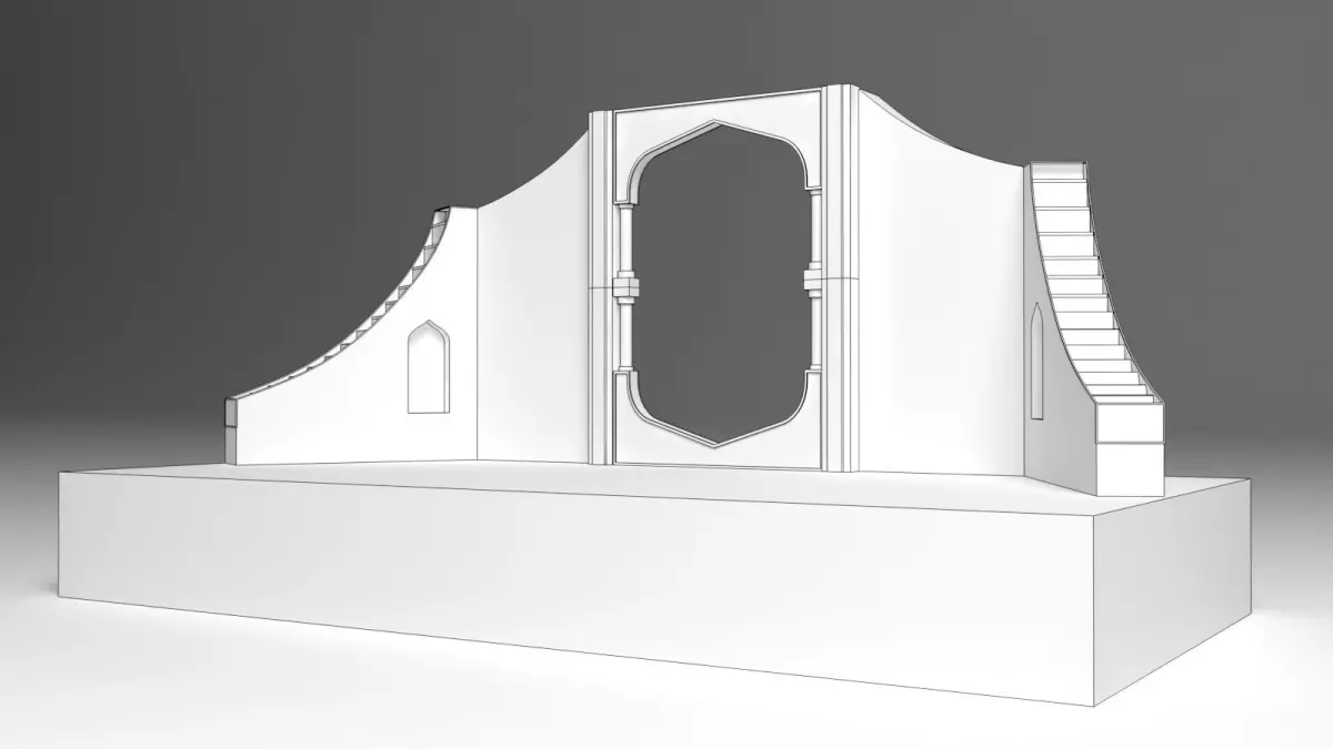 The 3D model of a wedding stage presents an opulent and captivating setting, meticulously designed to capture the essence of romance and elegance. The stage features a grand backdrop adorned with intricate floral arrangements, blending soft pastels with lush greenery to create a dreamy ambiance. Centered against this backdrop is a lavish, ornately carved archway, draped with delicate fabrics that cascade gracefully to the floor, enhancing the stage's majestic appeal.