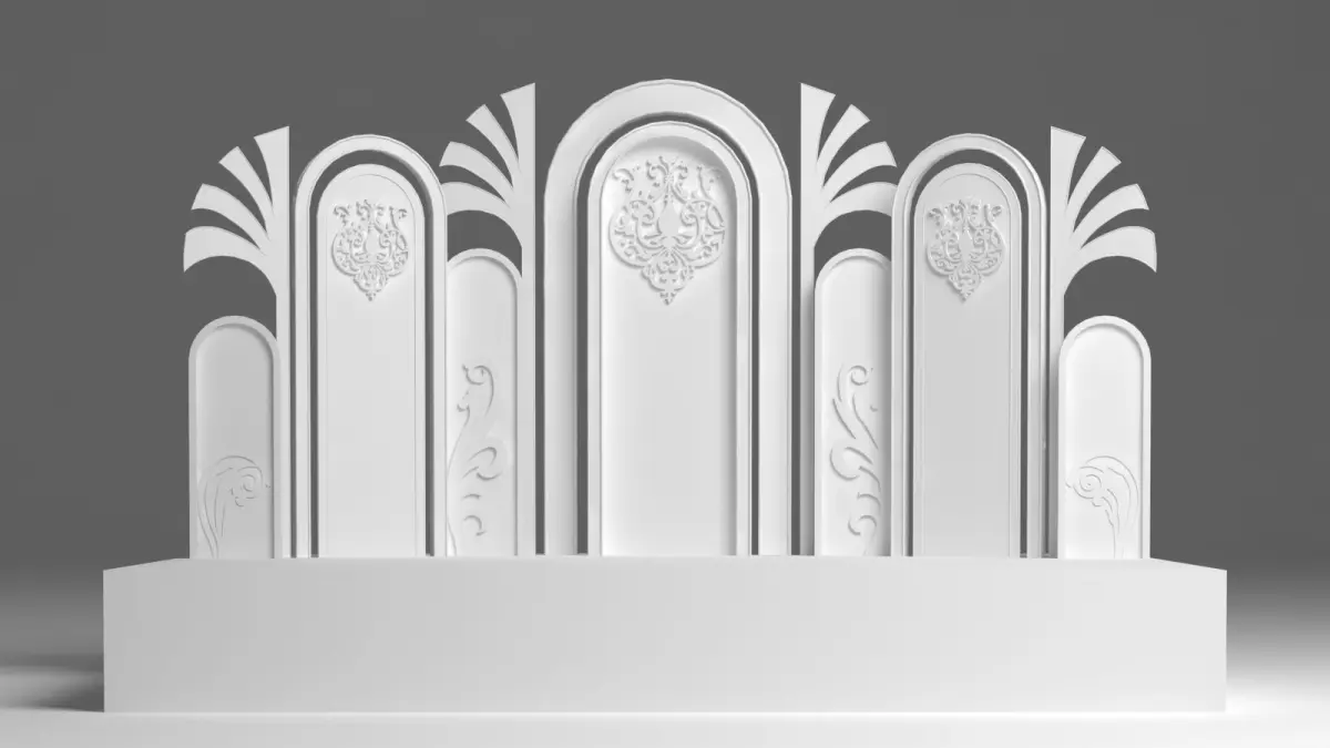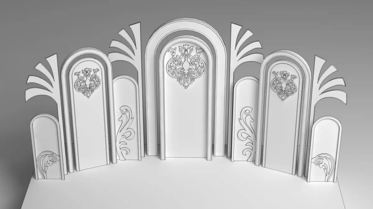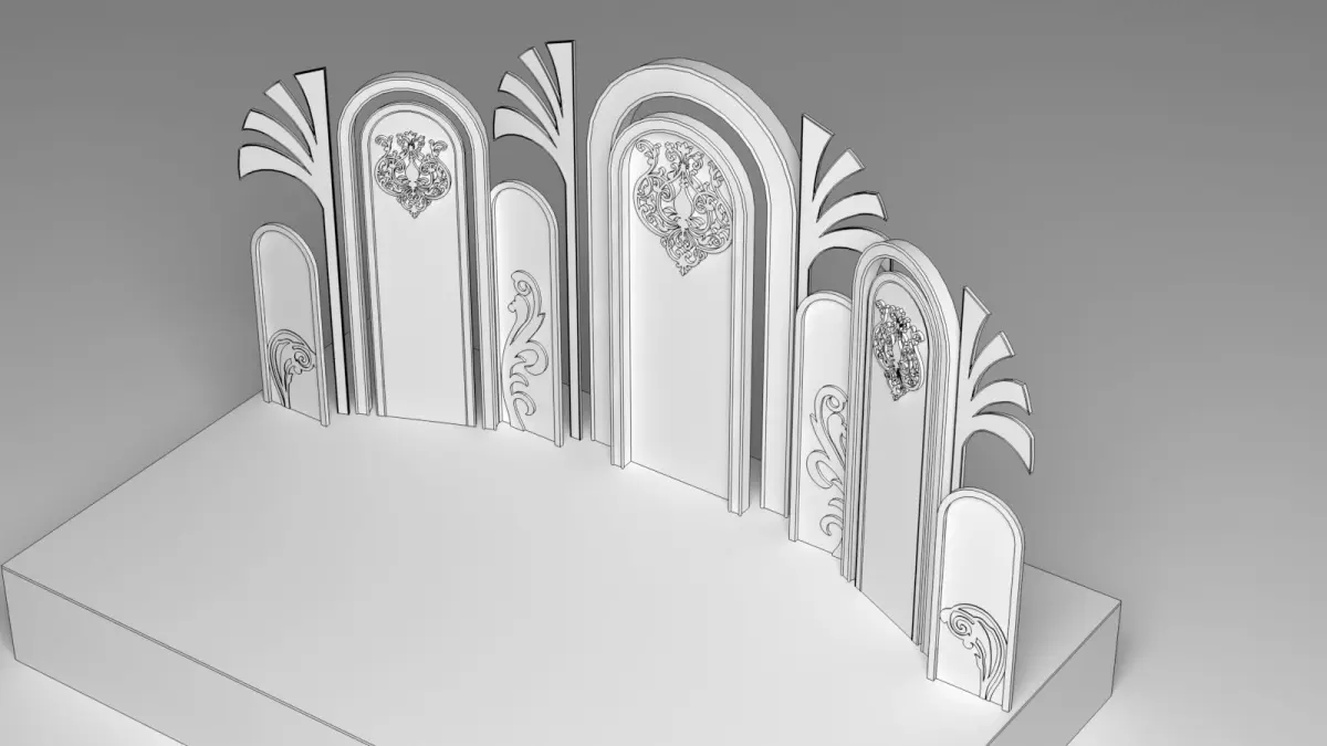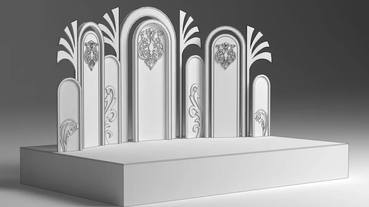 The wedding stage 3D model is a meticulously crafted digital representation designed to bring elegance and sophistication to any virtual wedding scene. The stage is set against a grand backdrop, featuring intricate floral arrangements that cascade from the top, creating a lush, romantic atmosphere. Delicate fairy lights are interwoven among the flowers, casting a soft, enchanting glow over the entire stage.