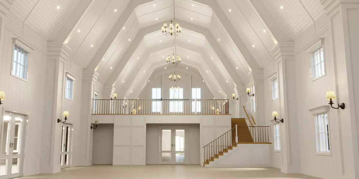 Scene Description:The venue features a barn-inspired facade with large windows, surrounded by landscaped greenery. The interior showcases a tall vaulted ceiling, chandeliers, wall sconces, and a mezzanine balcony, making it ideal for wedding or event visualizations.