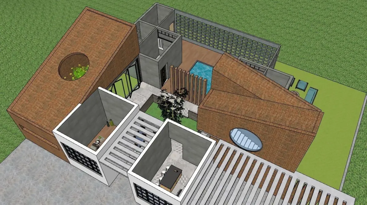 I have designed the Studio Abode to have a carpet area of 10x10m and remain a green space surrounded by forest on three sides. It is situated in nature with a material palette of basic concrete finish and a brick facade enhanced with a white color finish, which enhances its look and is punctuated with circular openings with brick jaali. In the middle, it has a small courtyard with a bamboo tree, which is directly visible when we enter the house. On the left, it has living space; on the right, it contains kitchen space, and a private room is kept on the above floor.