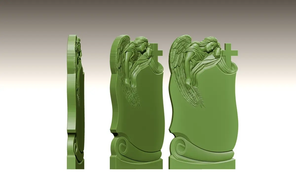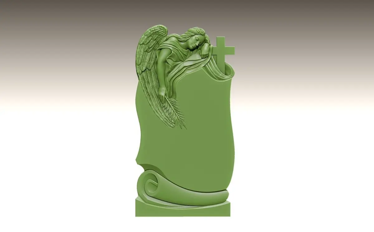 A finely detailed 3D relief of a sorrowful angel leaning over a cross, designed as a memorial or tombstone ornament. The angel’s graceful wings and peaceful posture evoke a sense of calm and eternal rest.High-resolution sculpt with smooth surfaces suitable for CNC or resin 3D printing