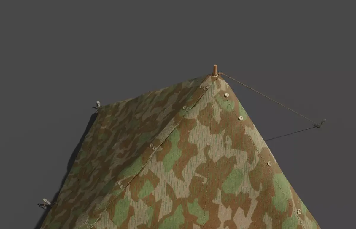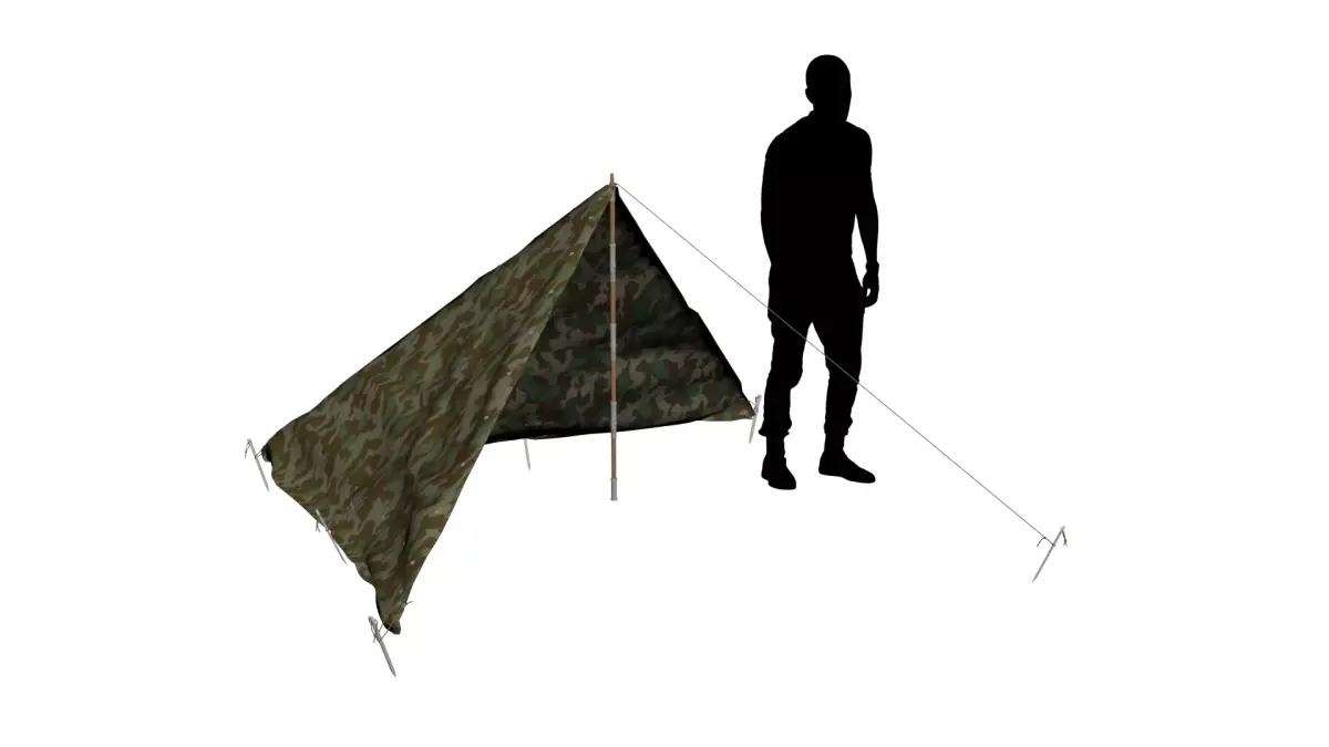 DE: Offenes Halbzelt als Wetterschutz für 2 Mann, zusammengesetzt aus zwei dreieckigen Zeltbahnen 31 gemäß H.Dv 205/1. (Vorschrift für die Zeltausrüstung des Mannes) von 1932. Die zwei Zeltbahnen in Splittertarn-Muster werden an den Kanten zusammengeknüpft und können mit einer vertikalen Stange, die aus einzelnen Zeltstäben zusammengesetzt wird, aufgerichtet werden. Die Ecken und Seiten sind jeweils mit Heringen aus Aluminium abgespannt. Die beiden Seiten der Zeltbahn sind beide mit Splittertarn bedruckt, allerdings in unterschiedlichen Farben, sodass die Zeltbahn für mehrere Vegetationsgebiete einsetzbar ist.
