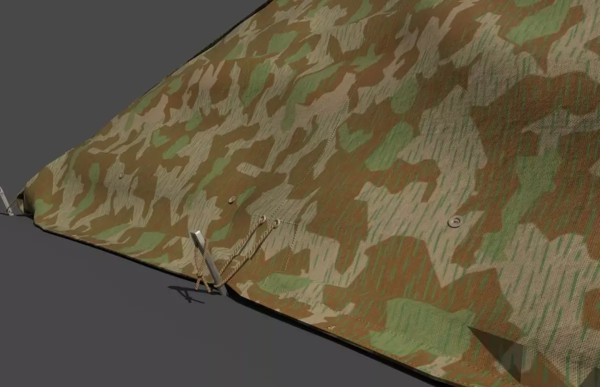 EN: Open half tent (Halbzelt) as weather protection for two men, composed of two triangular tent panels 31 in accordance with H.Dv 205/1. (Regulations for men's tent equipment) from 1932. The two tarps in splinter camouflage pattern are knotted together at the edges and can be erected with a vertical pole assembled from individual tent poles. The corners and sides are each secured with aluminum pegs. Both sides of the tent fabric are printed with splinter camouflage, but in different colors, so that the tent fabric can be used in several vegetation areas.