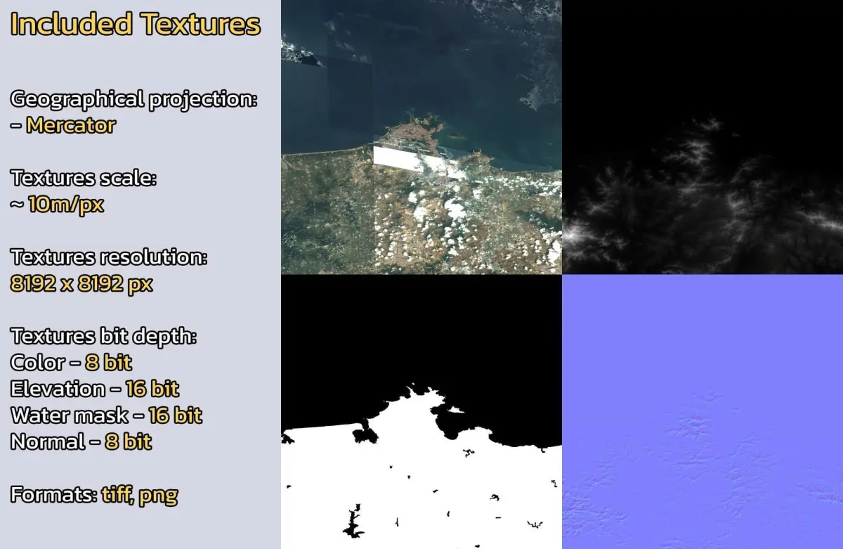 Warning: minor clouds/artifacts may be present on the diffuse color satellite texture due to the nature of the dataset. Check product images.