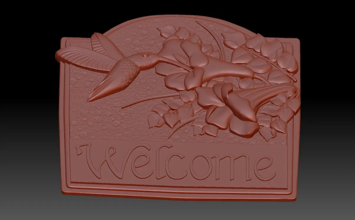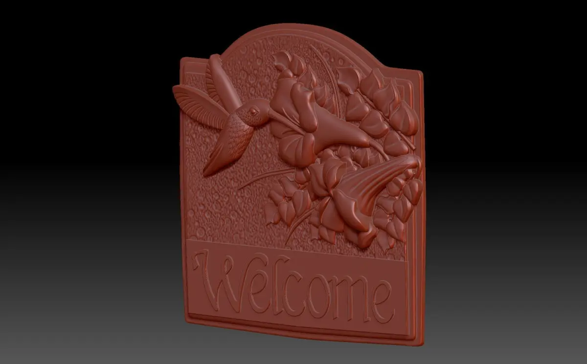 A 3D model of a bas-relief depicting a bird drinking the nectar of flowers. There is a welcome sign at the bottom. The work is suitable for 3D printing and CNC machine tools.